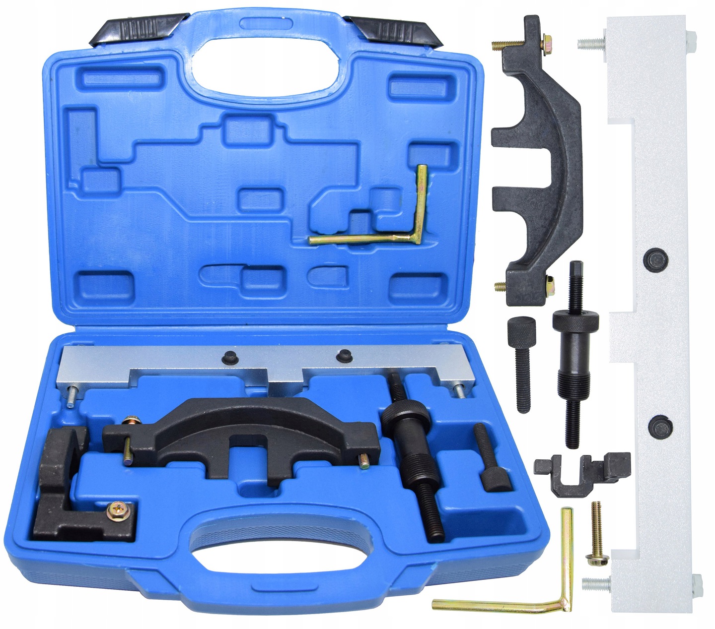 Комплект блокировки ГРМ для бензиновых двигателей объемом 1,6 л, устанавливается в автомобили BMW 1 и 3 серии. Комплект позволяет блокировать вал, устанавливать ГРМ, устанавливать датчик колеса и блокировать маховик.