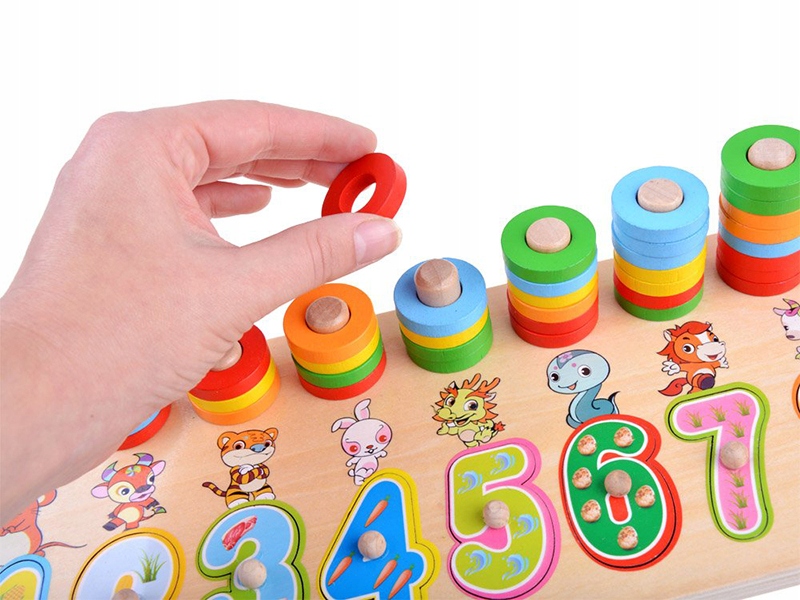 Красочная деревянная головоломка с цифрами и животными — отличный способ выучить числа, цвета и названия животных в игровой форме с раннего возраста. Это простой и интересный способ выучить и закрепить числа, сопоставляя фигуры и цвета с доской, а также узнавать их значения, размещая диски на соответствующих ставках. Благодаря тому, что цифры большие и расписаны различными узорами, ребенок легко расставит их и уберет с доски, а нарисованные животные наверняка облегчат задачу, показывая малышу, что они любят есть больше всего. Все элементы адаптированы под крошечную ручку ребенка. Несомненным преимуществом является то, что набор полностью выполнен из дерева. Благодаря этому он более безопасен, долговечен и экологичен, чем игрушки из пластика.