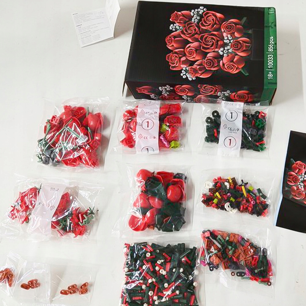 Полный букет: набор содержит 822 штук, которые создают 12 искусственных роз на длинных зеленых стеблях и 4 ветви Gypsophila (маленькие белые цветы).