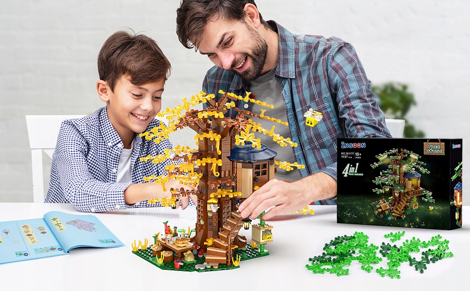 INSOON 4 в 1 Игрушка для постройки домика на дереве с цветами и светодиодной подсветкой, 1157 элементов Игрушка для постройки домика на дереве, Набор для постройки деревянного домика в лесу с пчелками, Подарок взрослым, детям, девочкам, мальчикам, возраст