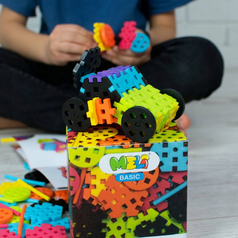 Время новых испытаний! Дополнительный набор Meli Basic Constructor — отличный способ разнообразить удовольствие владельцев блоков Meli Basic и Meli Basic Constructor. В наборе 60 элементов, таких как оси, колеса и шестигранники.