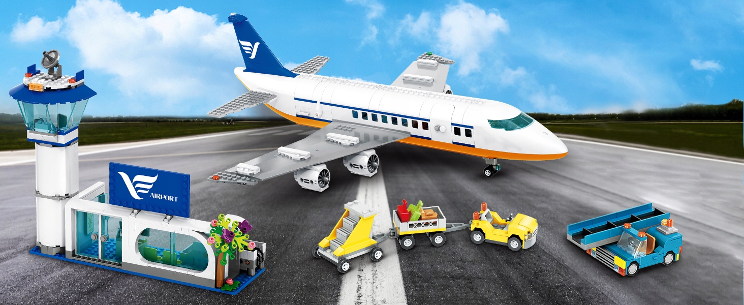 Набор блоков пассажирского самолета HGOKIDS включает в себя большой пассажирский самолет, багажный прицеп и эскалатор, конвейер для багажа, радиолокационную вышку, хорошо продуманный терминал аэропорта и множество забавных наклеек!