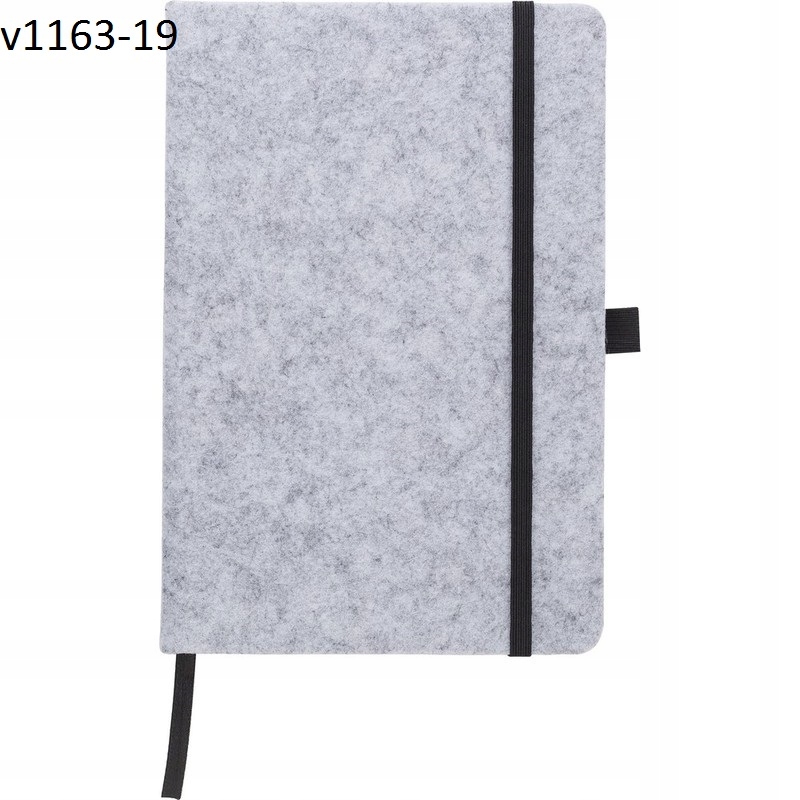 Блокнот формата А5 (160 листов в линейку), обложка из РПЭТ-фетра, место для письменных принадлежностей, лента-закладка и резинка для застежки.