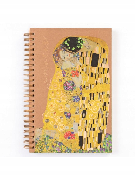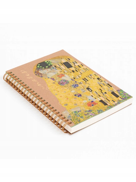 Декоративный спиральный блокнот с рельефной обложкой и узором, вдохновленным творчеством Густава Климта. Экологический блокнот, обложка которого изготовлена из 100% переработанных материалов. Блокнот, напечатанный в строчки, переплетенный золотой спиралью и отделанный зеленым форзацем.