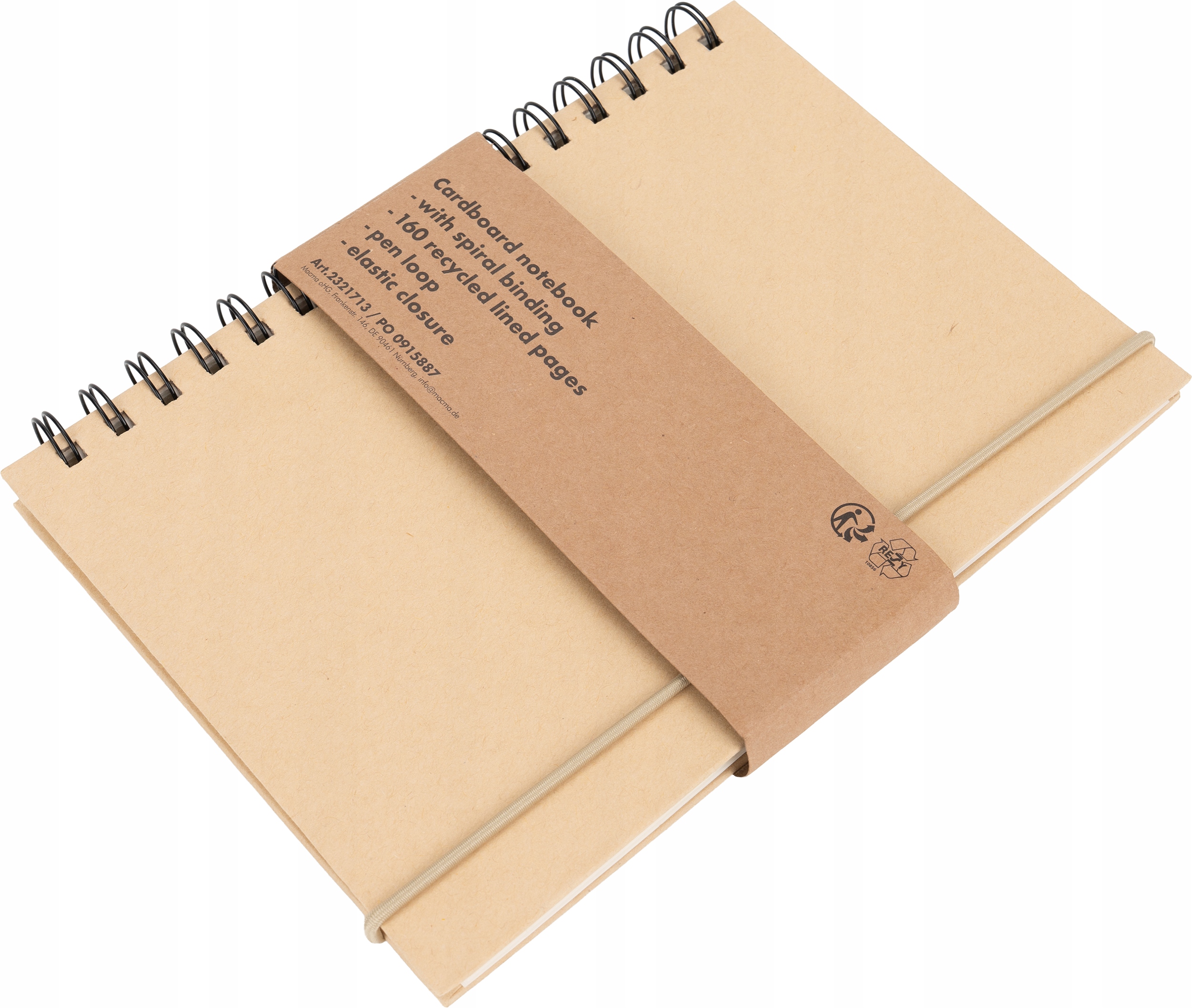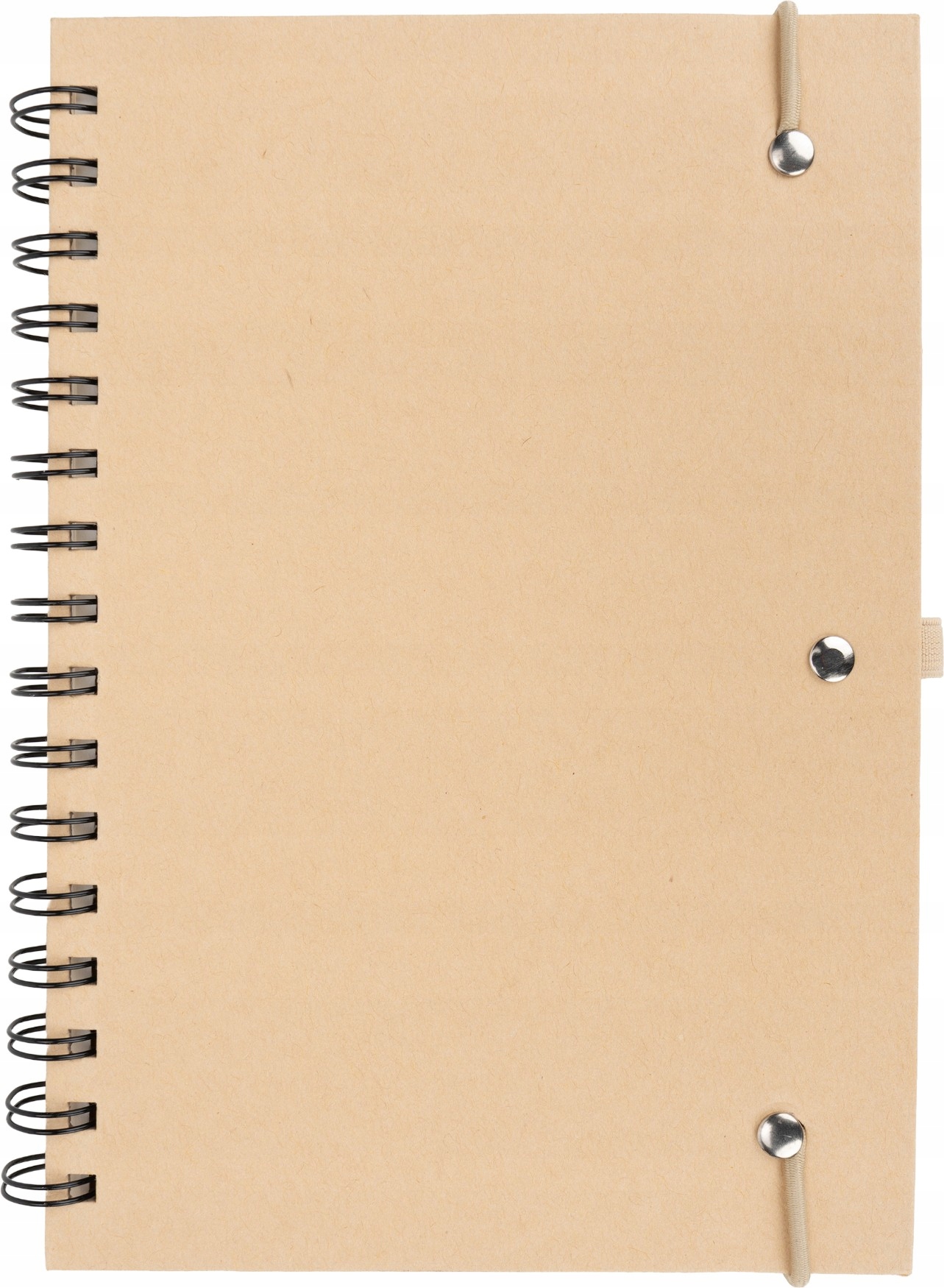 Блокнот формата А5, 160 страниц в линейку, изготовлен из переработанной бумаги. Имеет резинку для застегивания и петлю для ручки.