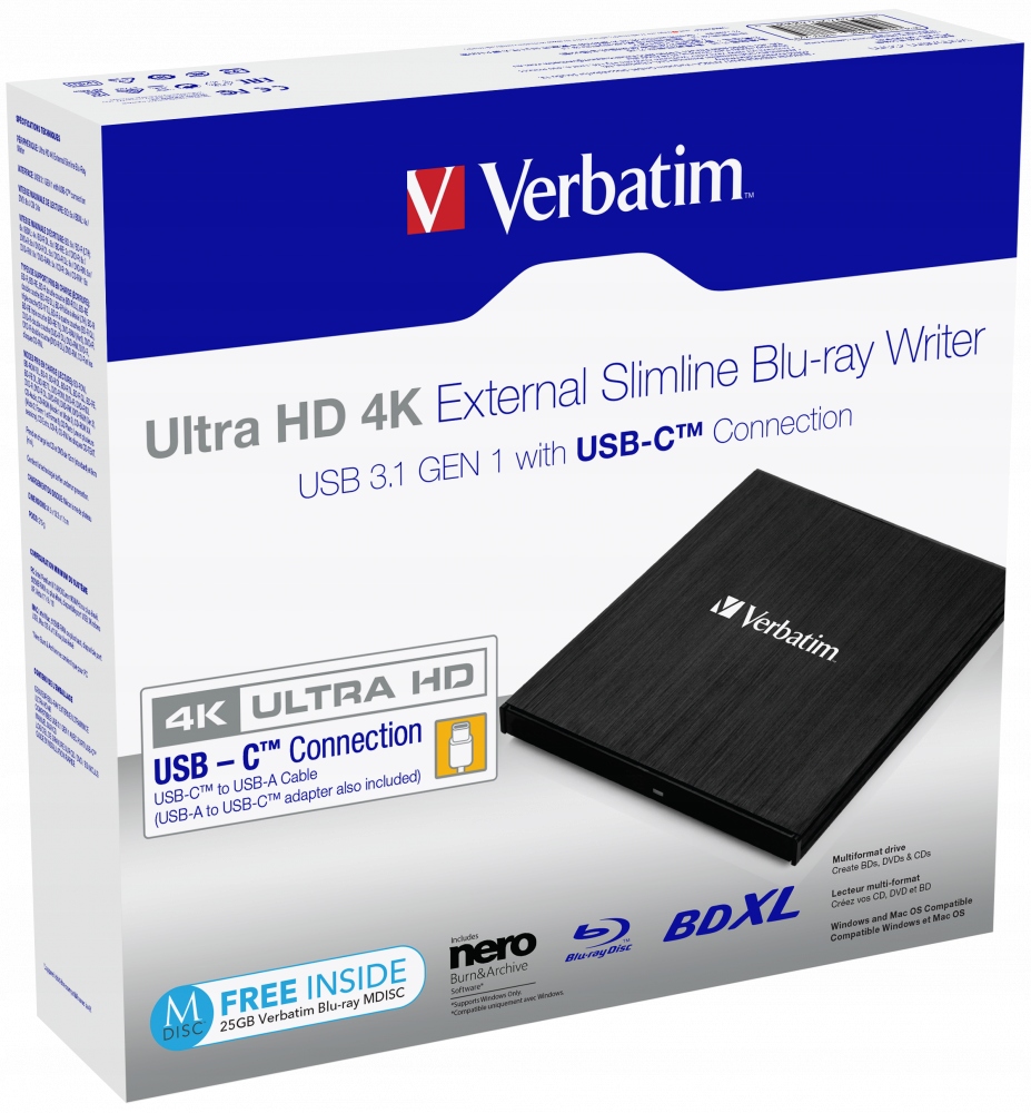 Устройство записи Blu-Ray VERBATIM 4K USB-C + MDISC + NERO #43888