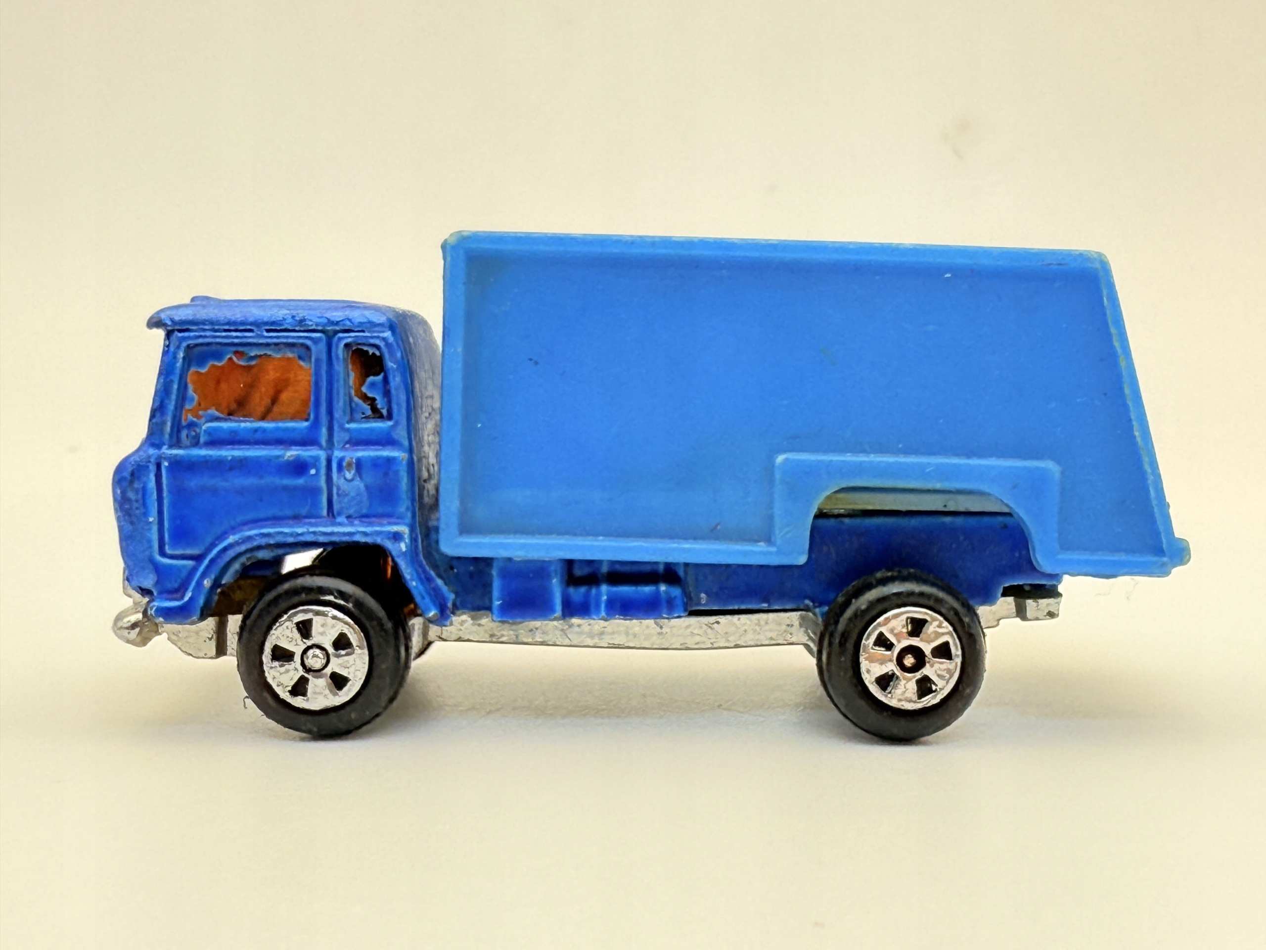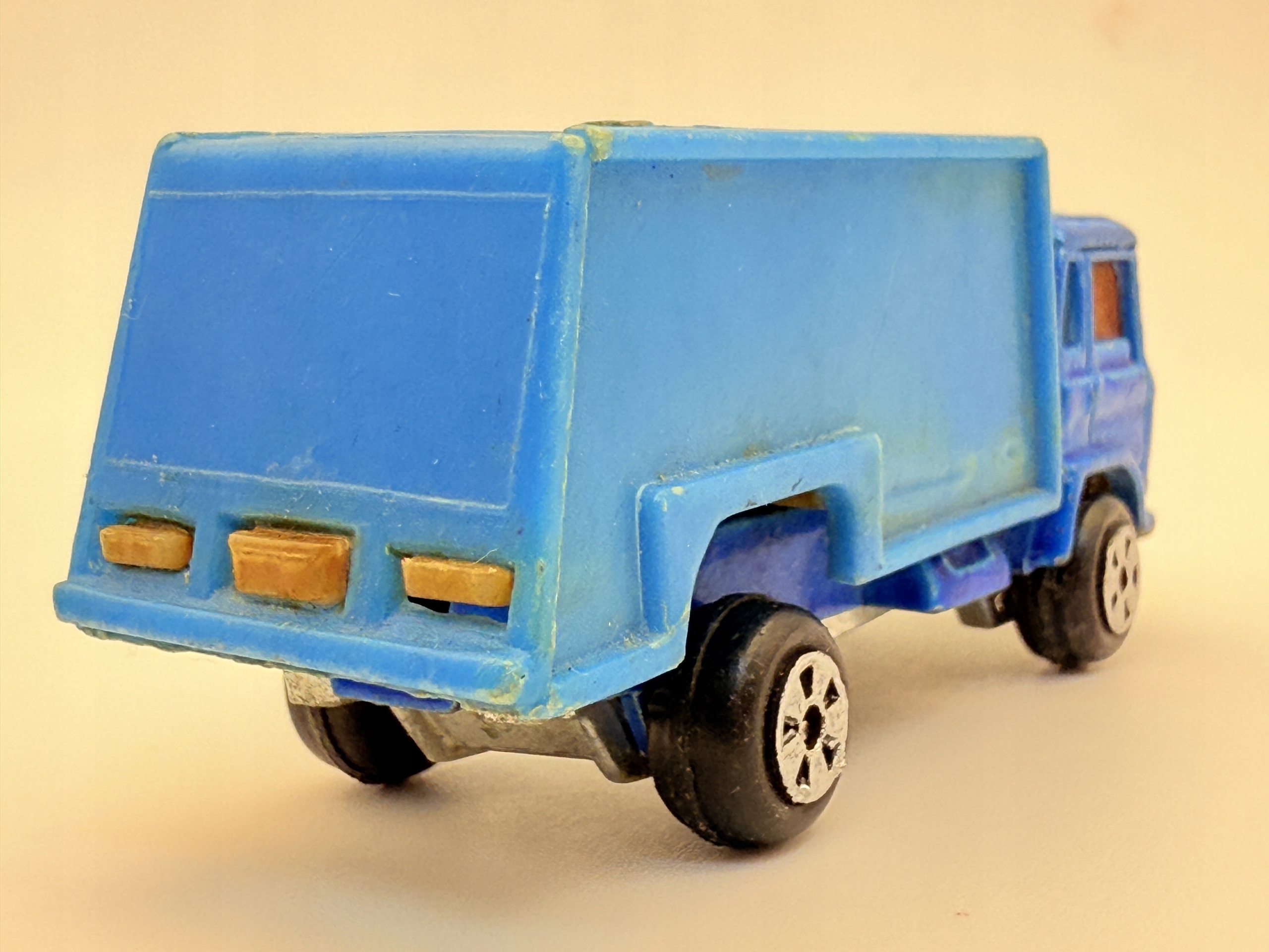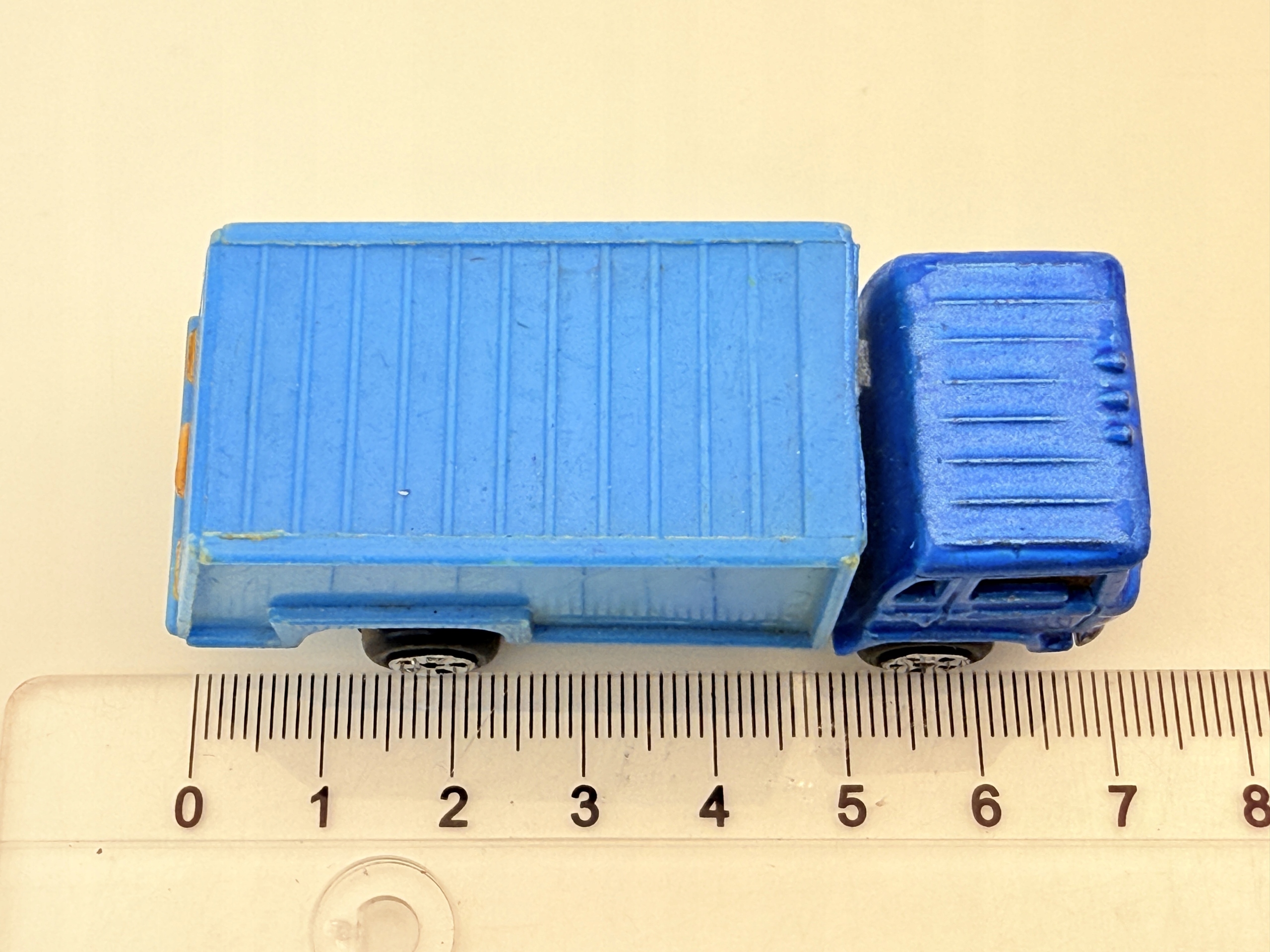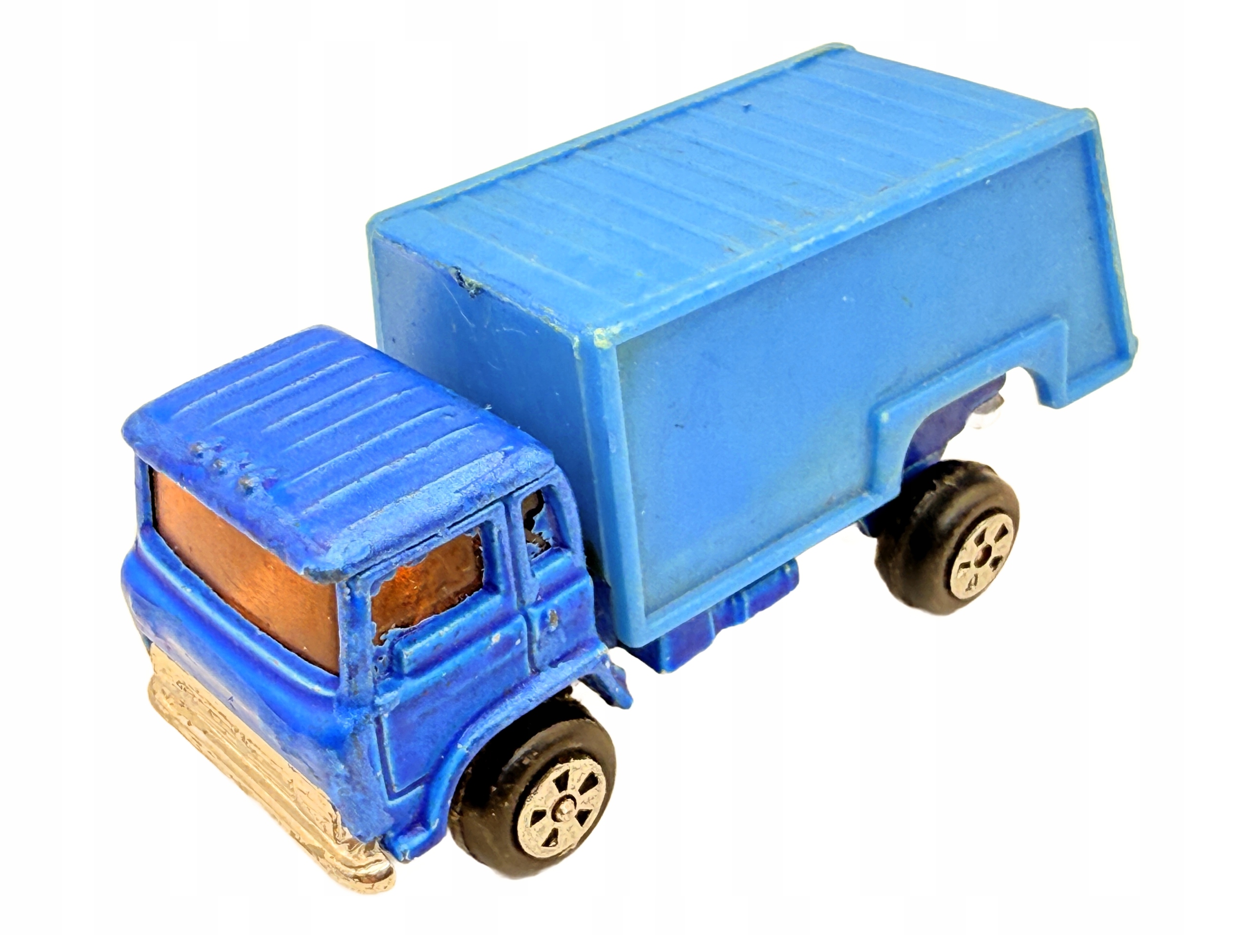 Этот ресорак, представляющий собой модель грузовика, отличается синим цветом с оранжевыми окнами и черными колесами с металлическими ободами. Изготовленный из металла и пластика, он представляет собой надежное исполнение. Длина 73 мм и закрытый грузовой отсек добавляют ему реалистичности. Состояние модели хорошее, хотя есть легкие царапины, что делает ее интересной для коллекционеров, ищущих модели с историей.