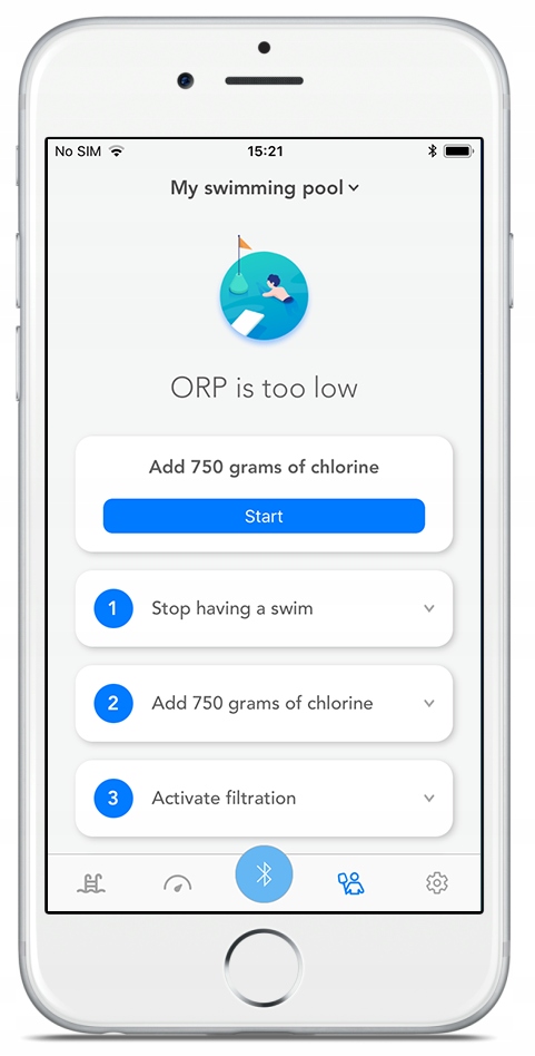 Когда бассейн требует вмешательства, информация с рекомендациями по дозировке отправляется пользователю телефон.