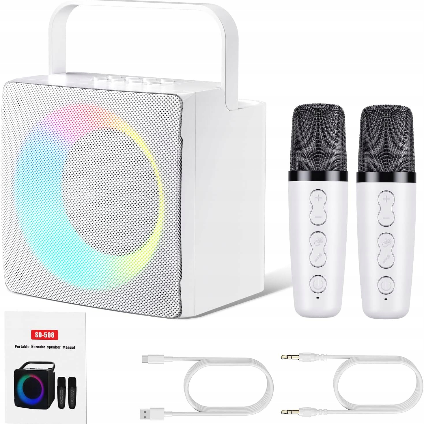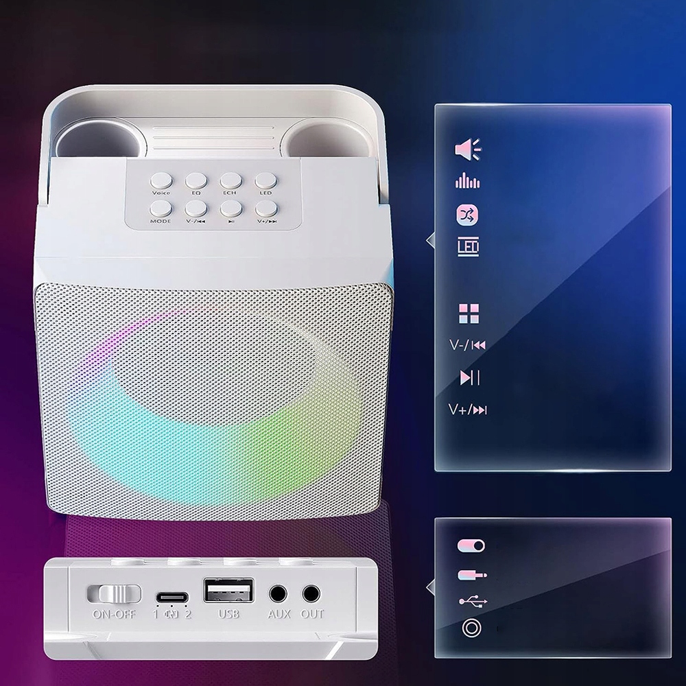 - 🎤 - 【Многоцветная подсветка для вечеринки】: Динамик для пения песен отображает яркие и красочные светодиодные фонари. Вы можете изменить эффект освещения, чтобы создать атмосферу вечеринки. Нажмите и удерживайте кнопку, чтобы выключить свет. Идеальный подарок для семьи и друзей.