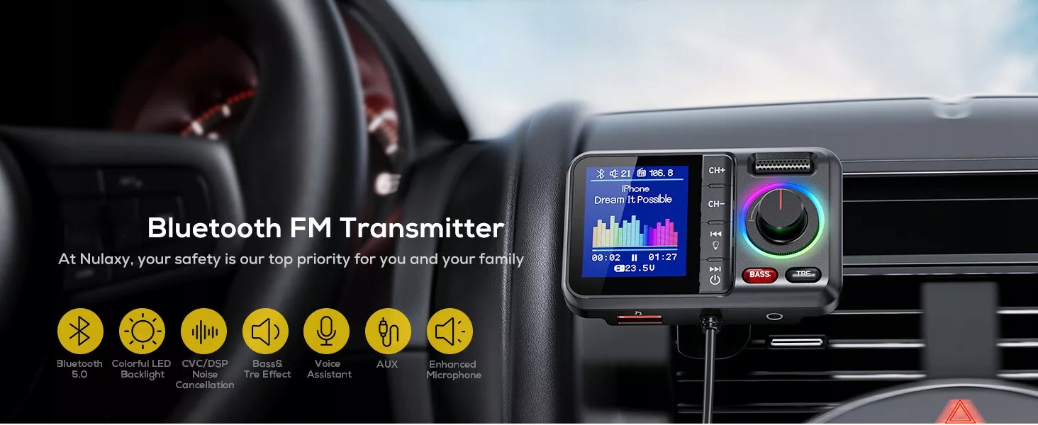 Большой цветной экран и зажим для вентиляционного отверстия: Автомобильный адаптер Bluetooth оснащен большим цветным экраном, на котором отображается дополнительная информация, например номера входящих вызовов, напряжение автомобильного аккумулятора, частота FM и названия песен. Кроме того, установка вентиляционного отверстия обеспечивает лучший угол обзора, что повышает вашу безопасность.