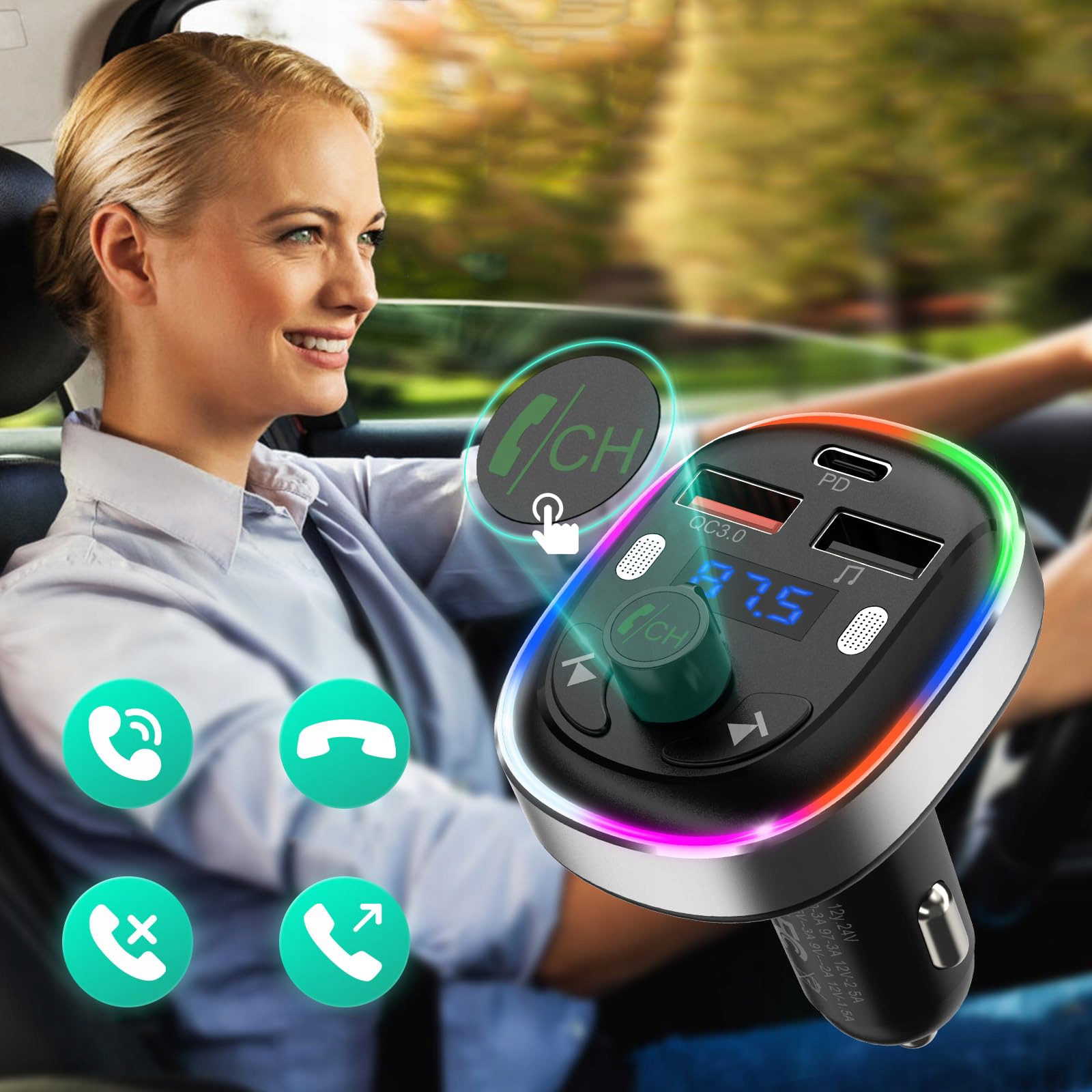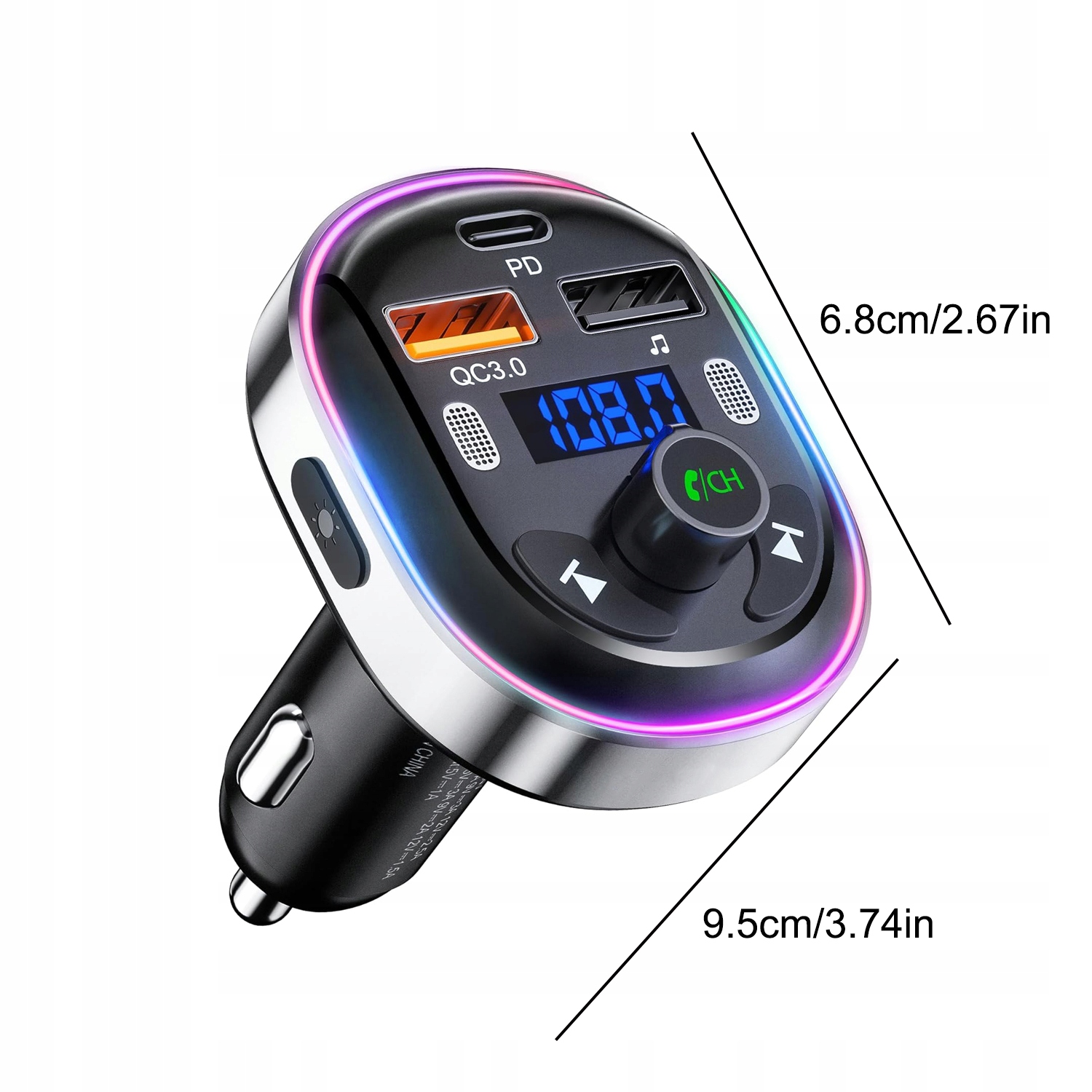 - ⚡【Цветные светодиоды, широкая совместимость】: Передатчик FM оснащен цветными светодиодами, которые делают ехать приятнее. Также имеется кнопка выключения света. Этот передатчик Bluetooth полностью совместим с моделями с напряжением 12–24 В (седаны, внедорожники, грузовики и т. д.).