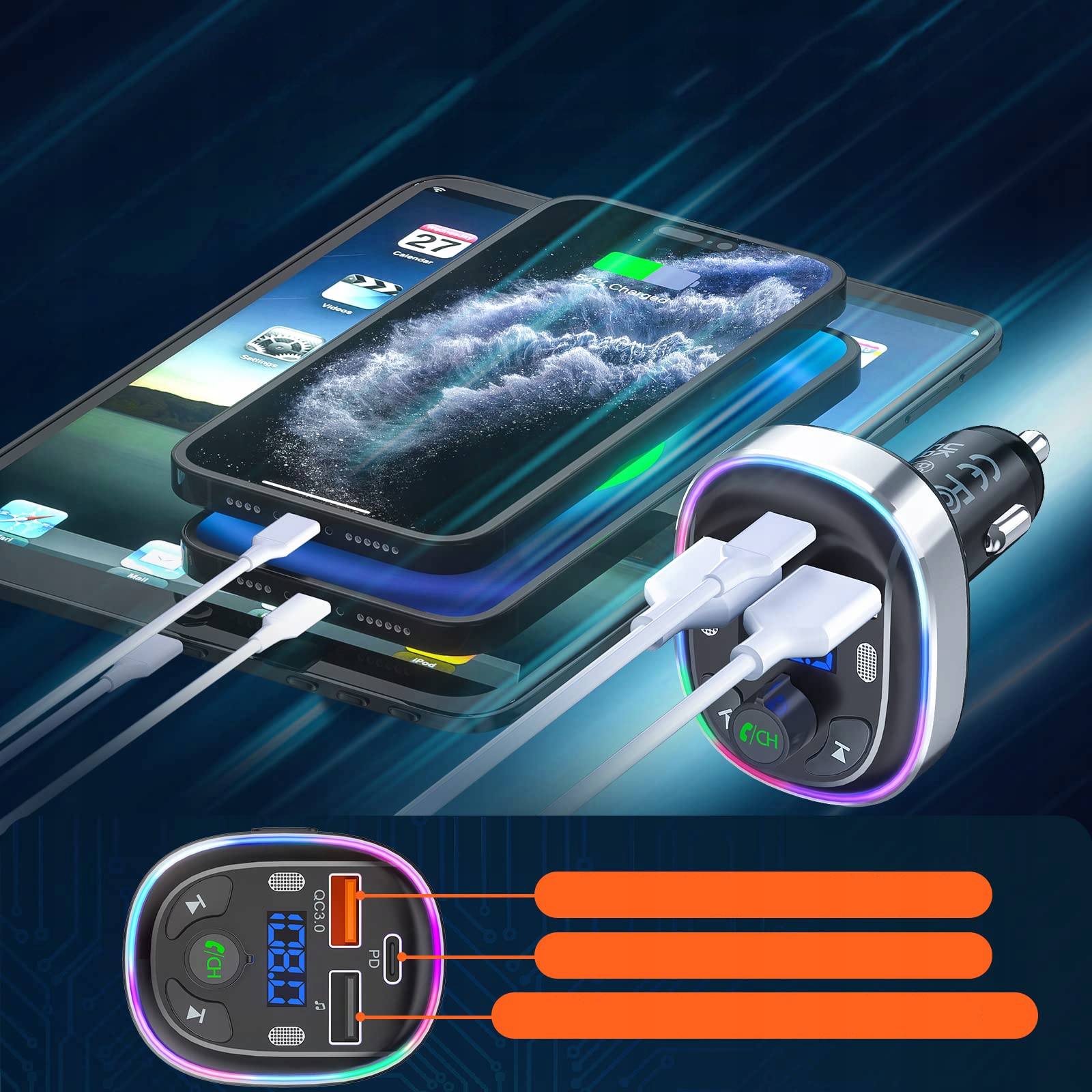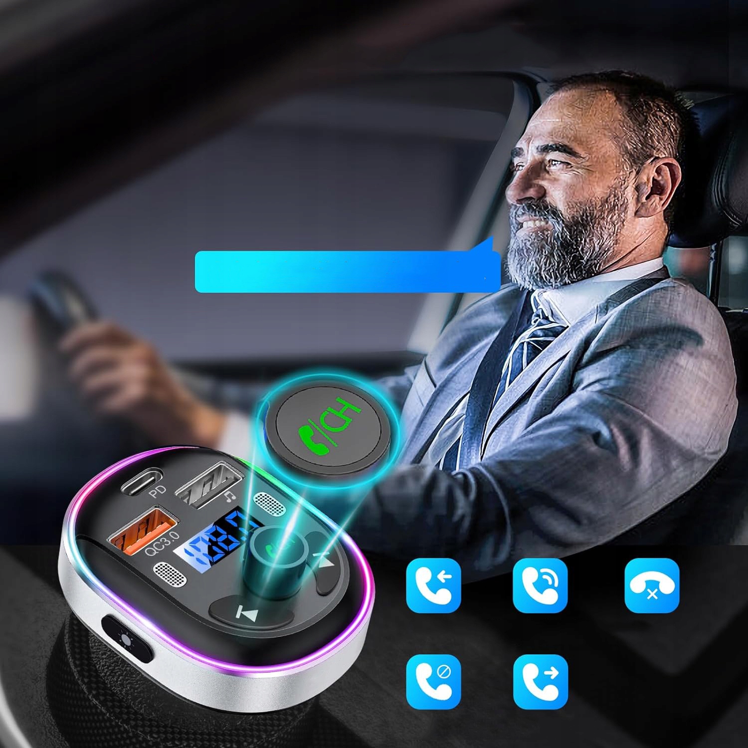 ⏩⏩⏩Маленький многофункциональный FM-передатчик Bluetooth 5.3 PD 30 Вт QC3.0 18 Вт, быстрая зарядка 2 микрофона с поддержкой 7-цветного светодиода