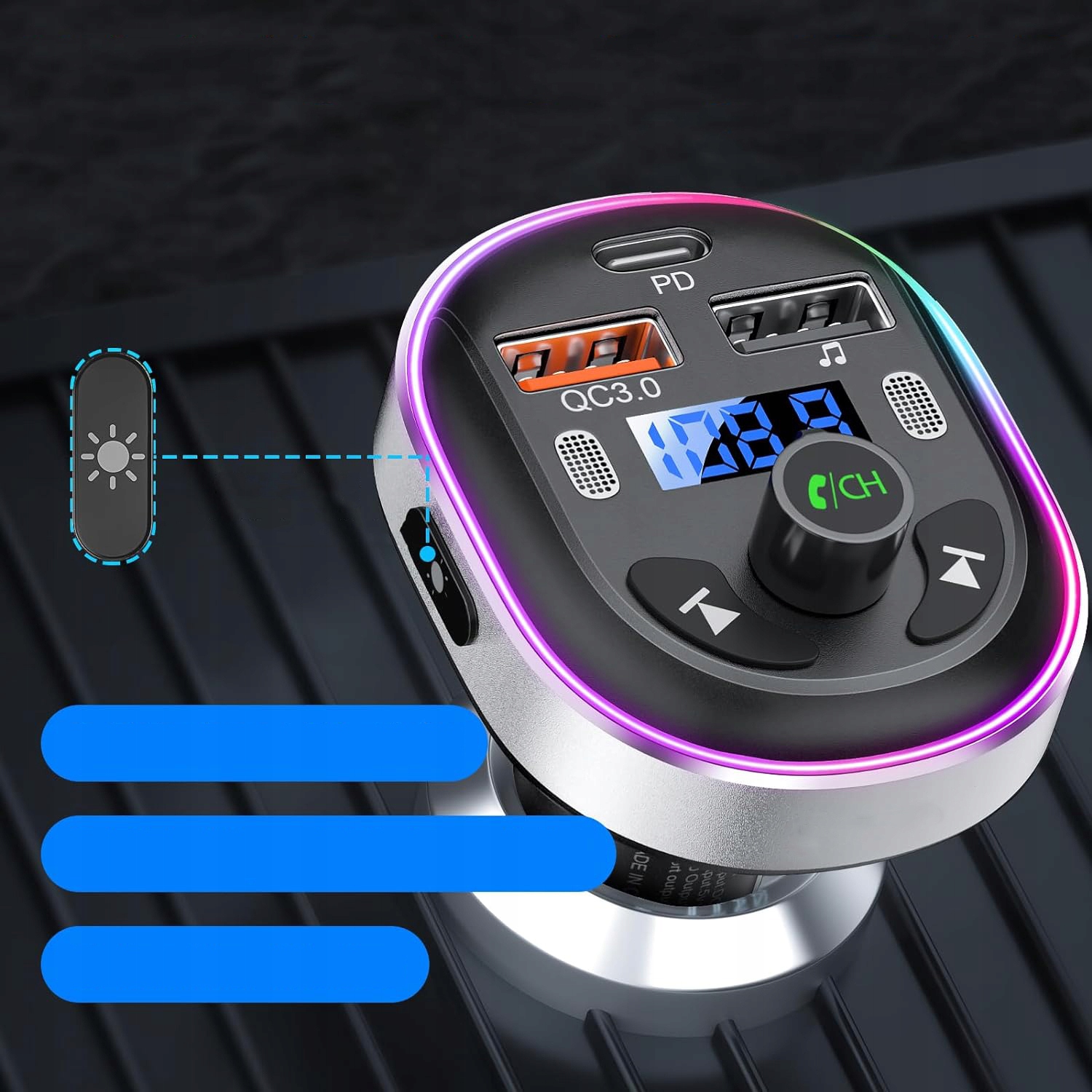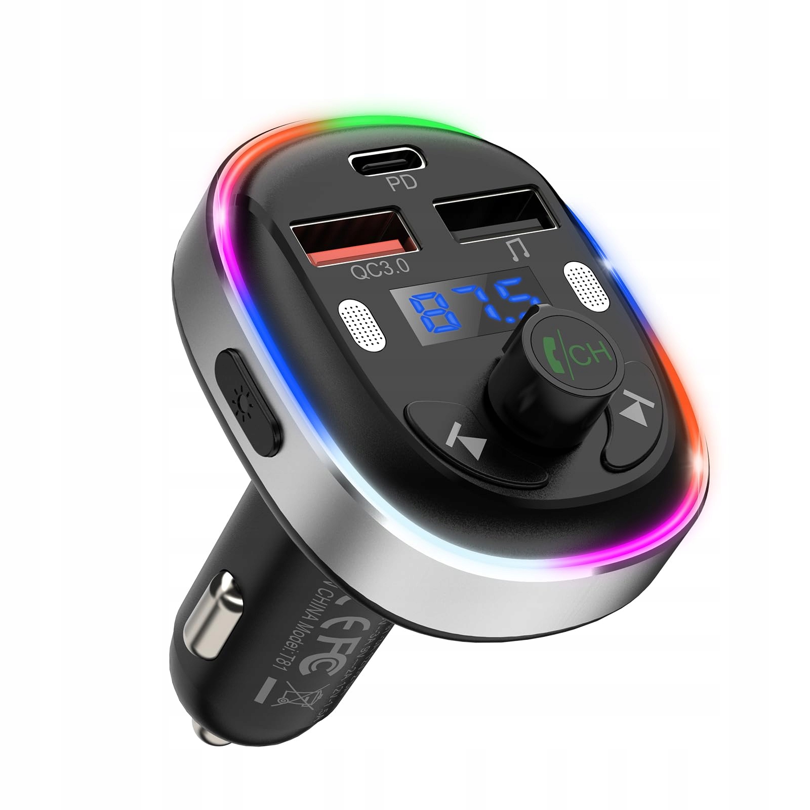- ⚡3 порта зарядки: Этот Bluetooth-передатчик оснащен портами зарядки USB PD 30 Вт Type-C и QC3.0 18 Вт, которые обеспечивают четырехкратную скорость чем стандартные порты. Примечание. Быструю зарядку QC3.0 и быструю зарядку PD (тип C) нельзя реализовать одновременно. Дополнительный USB-порт для зарядки (5 В/1 А) можно использовать в качестве порта для USB-накопителя (32 г) для воспроизведения музыки. 7-цветная светодиодная подсветка создает романтическую атмосферу при беге ночью.