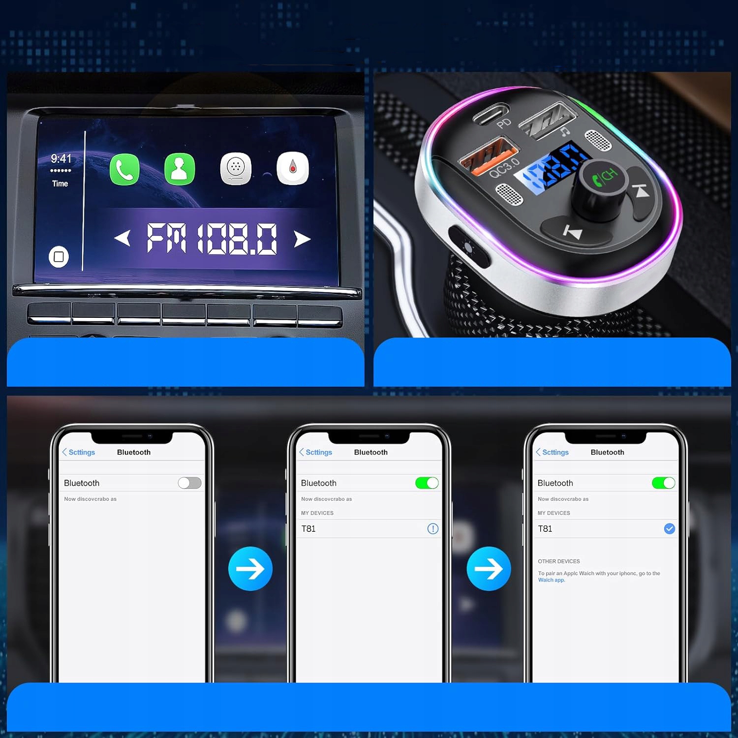 - ⚡【Поддержка Siri и Google Voice Assistant】:Установив передатчик Bluetooth в автомобиле, вы можете сосредоточиться на совершении звонков, отправке сообщений или прокладывании маршрута, активировав Siri или Google Assistant. С этой опцией вы можете ездить более безопасно.