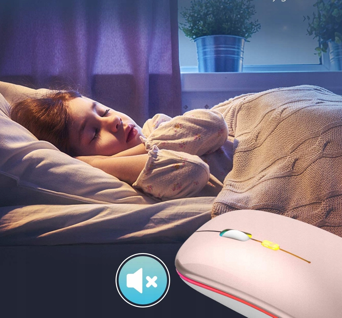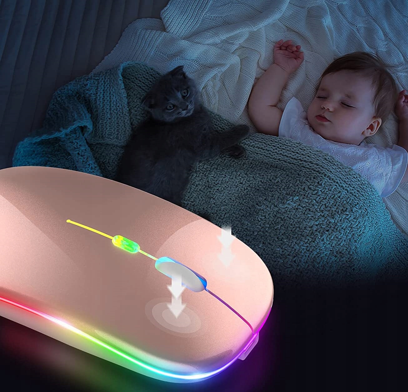 7 разноцветных светодиодных индикаторов меняются поочередно, успокаивающий свет освещает мышь в темноте.