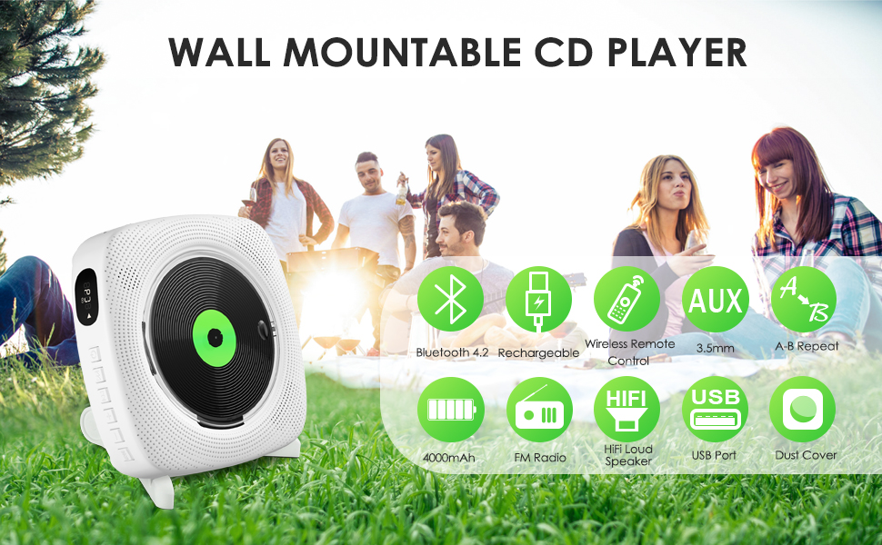 - Два варианта размещения: проигрыватель компакт-дисков Bluetooth поставляется с комплектом для настенного крепления и диском, который можно закрепить на настенная, которая делает ваш дом более элегантным и художественным, и поставляется с подставкой для стола или стола. Креативный дизайн с пылезащитным чехлом. Не беспокойтесь о проблемах с воспроизведением компакт-дисков, вызванных накоплением пыли.