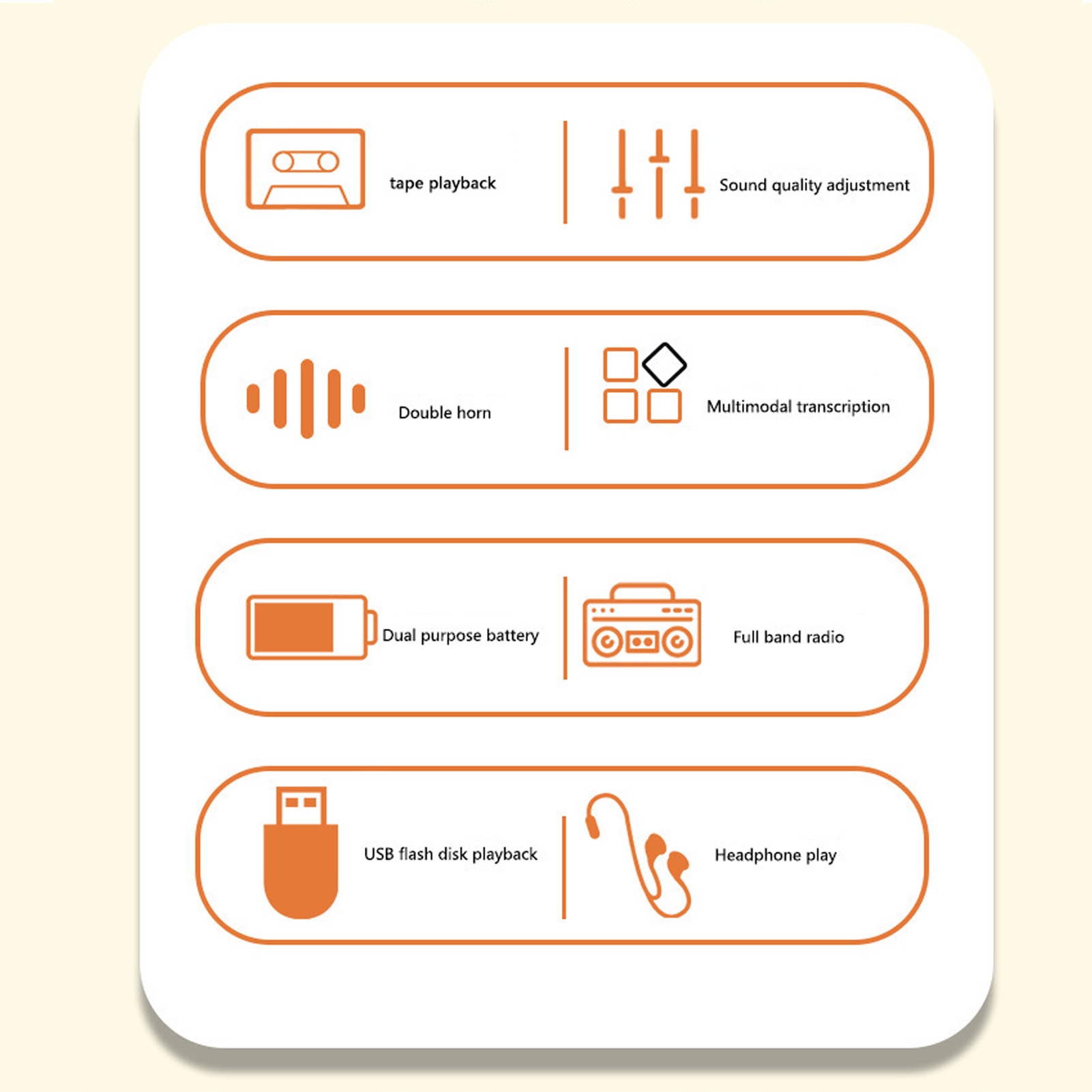 - Функция: запись кассеты, воспроизведение, FM-радио, MW-радио, воспроизведение Bluetooth, воспроизведение U-диска, воспроизведение небольшой карты памяти