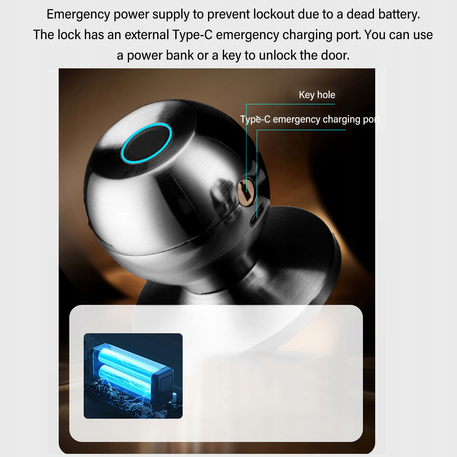 1. Способы разблокировки 3 в 1: умная дверная ручка имеет 3 способа разблокировки в 1 замке, разблокировку по отпечатку пальца, управление через приложение, аварийные запасные ключи, идеальный дверной замок с защитой от отпечатков пальцев для блокировки двери без ключа.