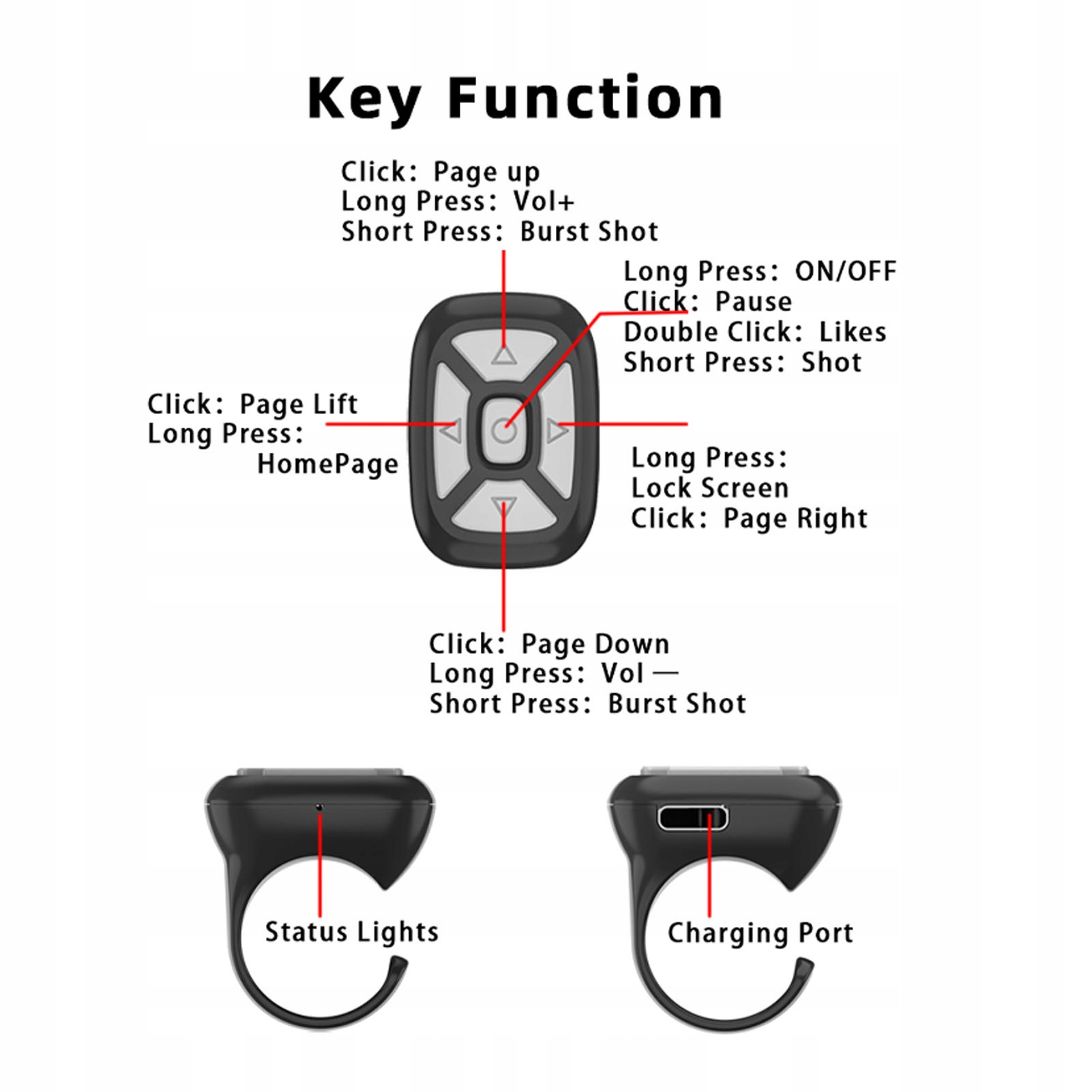 1. Многофункциональное: через соединение Bluetooth пульт дистанционного управления с кольцом мобильного телефона может управлять мобильным телефоном и планшетом, чтобы повернуть страницы вверх и вниз, повернуть страницы влево и вправо, увеличить или уменьшить громкость, приостановить воспроизведение, например, выполнять фотографии, записывать фильмы и другие операции, освобождая ваши руки.