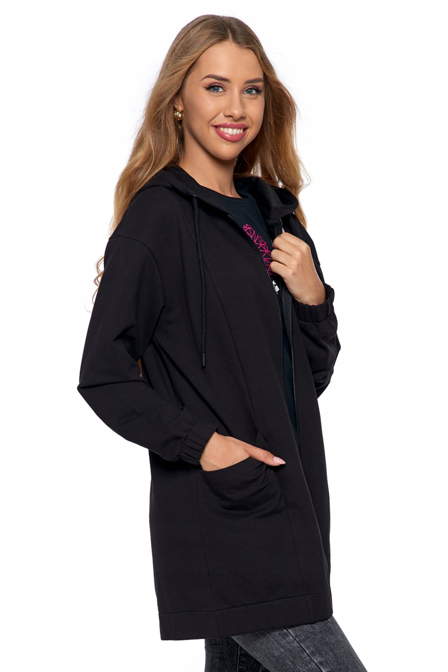 Длинная женская толстовка из материалов высочайшего качества. Спереди имеется привлекательная вертикальная строчка. Застегивается на реактивную молнию. Он имеет практичные глубокие карманы с обеих сторон спереди. В них легко поместится телефон или кошелек. Нижняя часть толстовки и рукава отделаны манжетами. Дополнительно у толстовки есть капюшон, завязанный завязками. Он доступен в универсальном и вневременном черном цвете. Он будет отлично сочетаться с классическими джинсами или леггинсами. Черный свитшот – одна из основ базового гардероба.