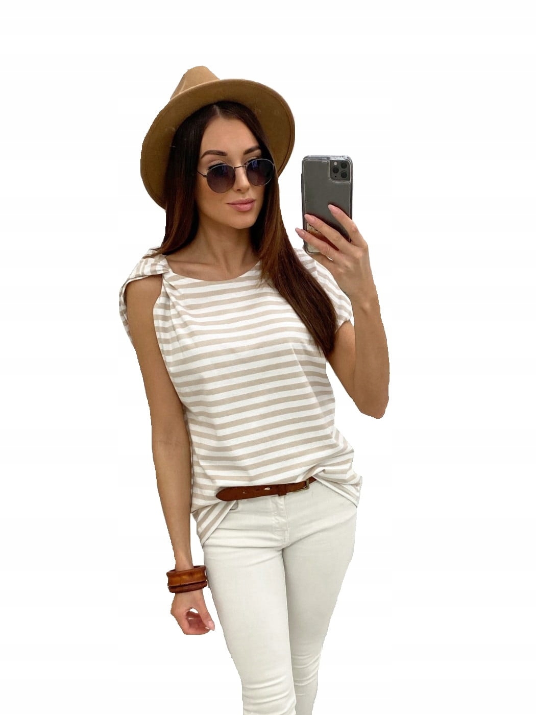 Белая блузка в бежевую полоску от польского производителя Top Moda Collection. Модная блузка с короткими рукавами изготовлена в Польше из качественного, удобного в носке материала.