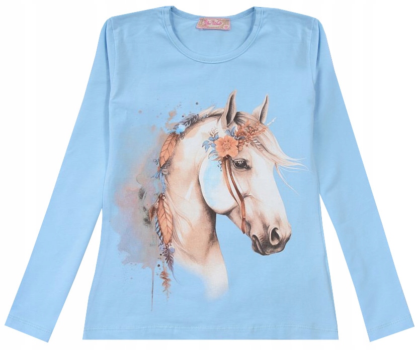 БЛУЗКА ДІВЧАЧА бавовна ДОВГИЙ РУКАВ КІНЬ FLOWERS FEATHERS синій 152 T002E
