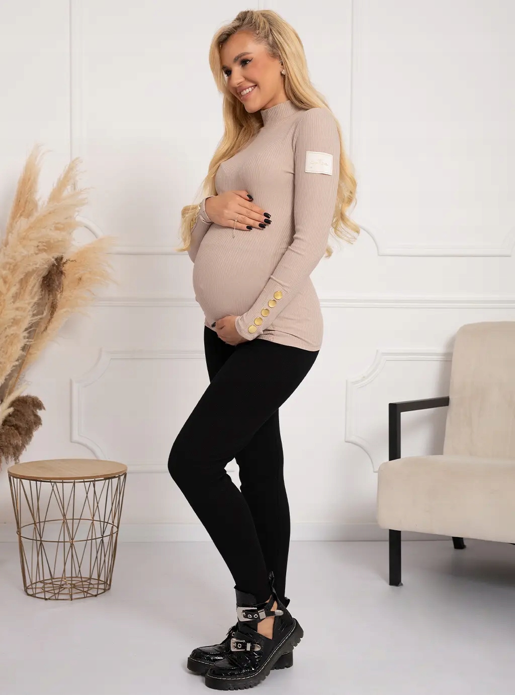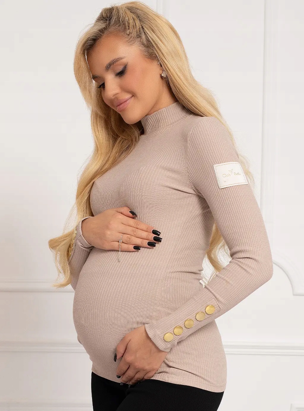 У него длинные рукава, украшенные золотыми пуговицами, оно выполнено из ребристого материала, который подчеркивает женские достоинства и придает ему шарм. Идеально сидит на беременном животе. Golfi также будет идеально смотреться после беременности в качестве основы, которая сочетается практически со всем!