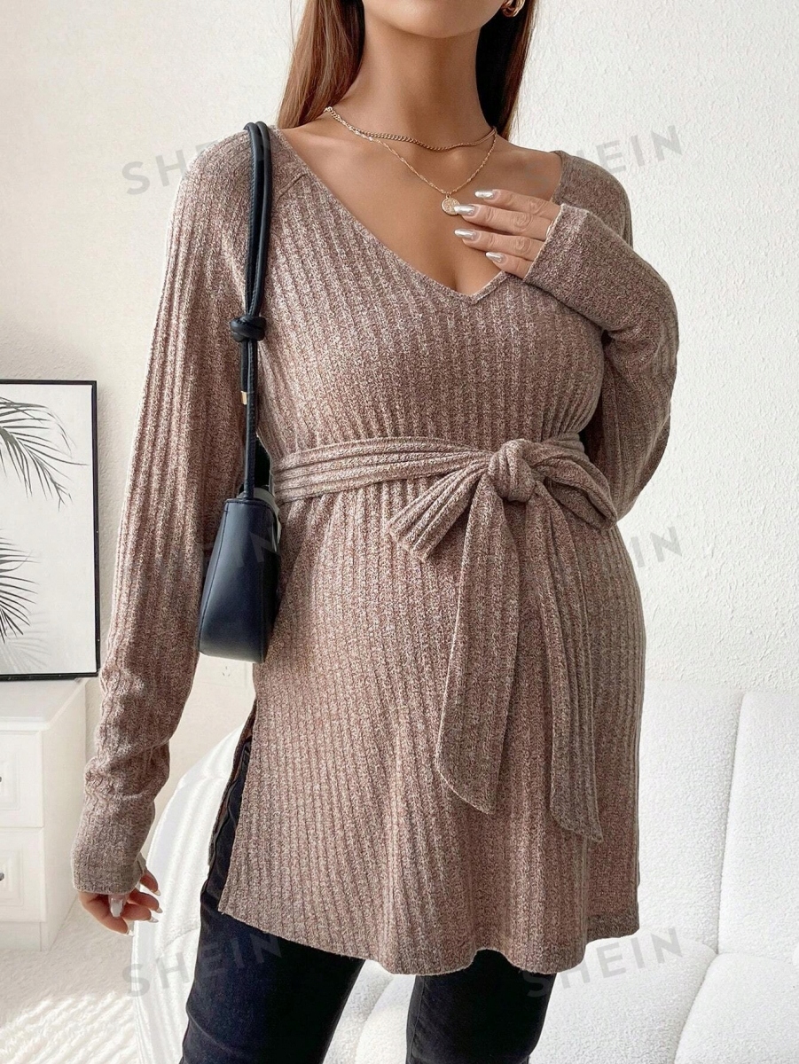 БЛУЗКА ДЛЯ ВАГІСТНИХ SHEIN MATERNITY З ПОЯСОМ І РОЗРІЗАМИ, КОРИЧНЕВА M 719