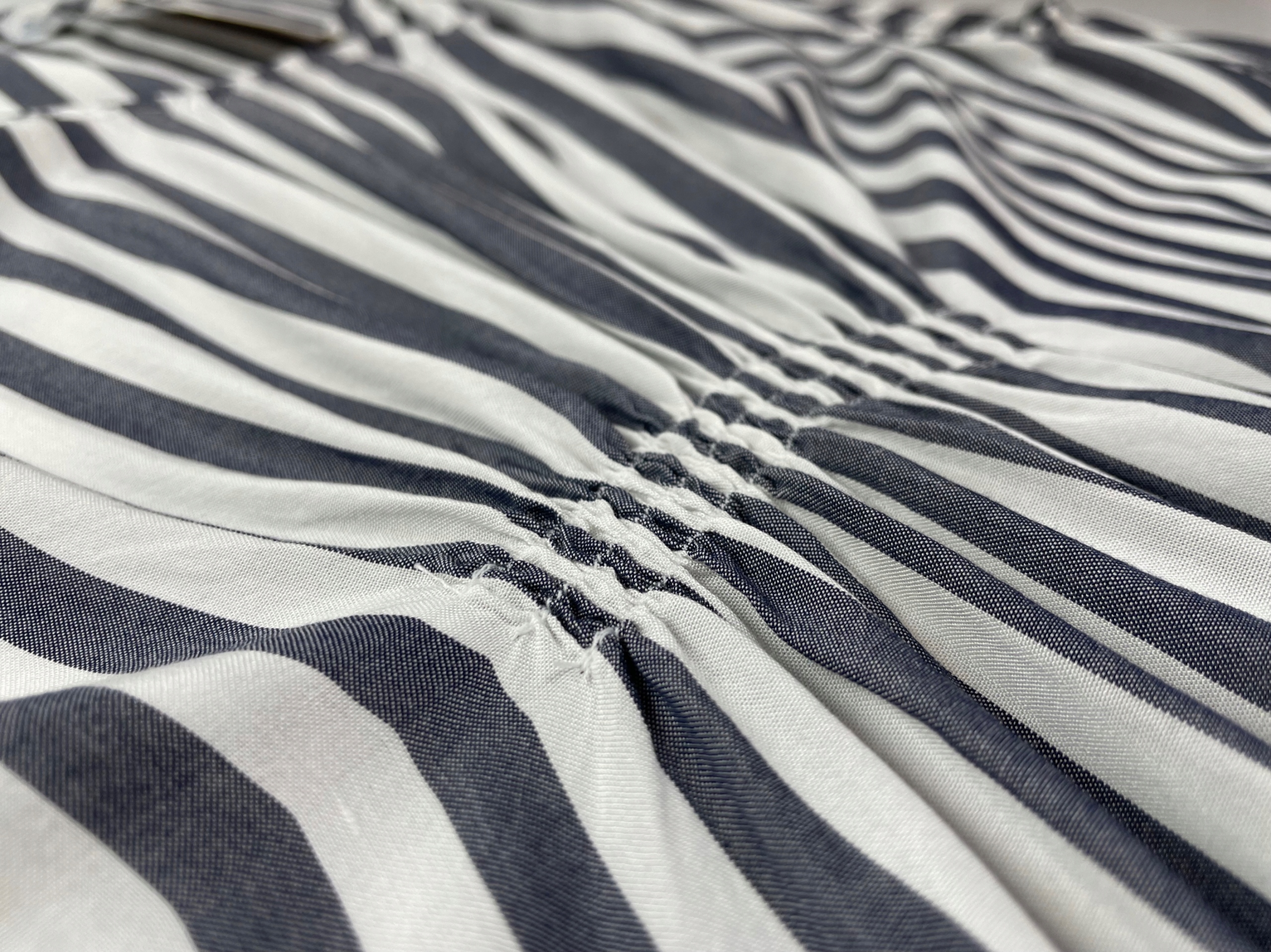 - Блузка для беременных. Он имеет узор из белых и серых вертикальных полос. Блузка имеет V-образный вырез и не имеет рукавов. Имеются резиновые манжеты на уровне плеч. В блузке собран материал под грудью, который подчеркивает живот беременной.