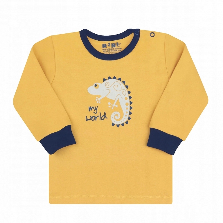 Блузка для мальчика медового цвета, застегивается на кнопки на плече. Отделка блузки темно-синего цвета. Принт представляет собой мотив-хамелеон. Модель с длинным рукавом. Блузка изготовлена из высококачественного натурального хлопка.