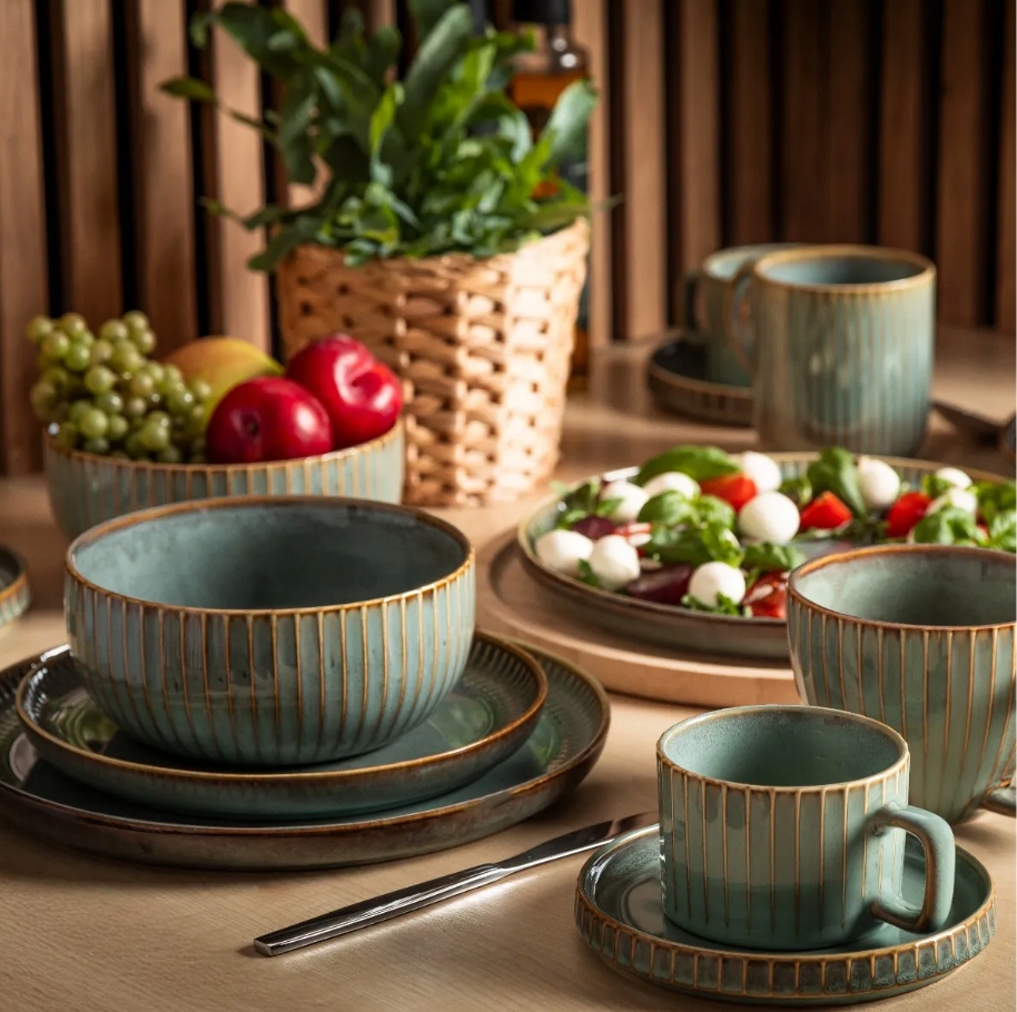 Reactive Sage – это коллекция посуды, вдохновленная гармонией природы и художественным мастерством. Он характеризуется уникальным эффектом реактивного остекления, который делает каждый элемент уникальным. Тонкие рифленые детали по краям придают посуде элегантность и современный характер, а теплые, естественные цвета придают посуде неповторимую атмосферу. Эта коллекция прекрасно впишется как в современный интерьер, так и в классическую аранжировку, подчеркнув красоту подаваемых блюд.