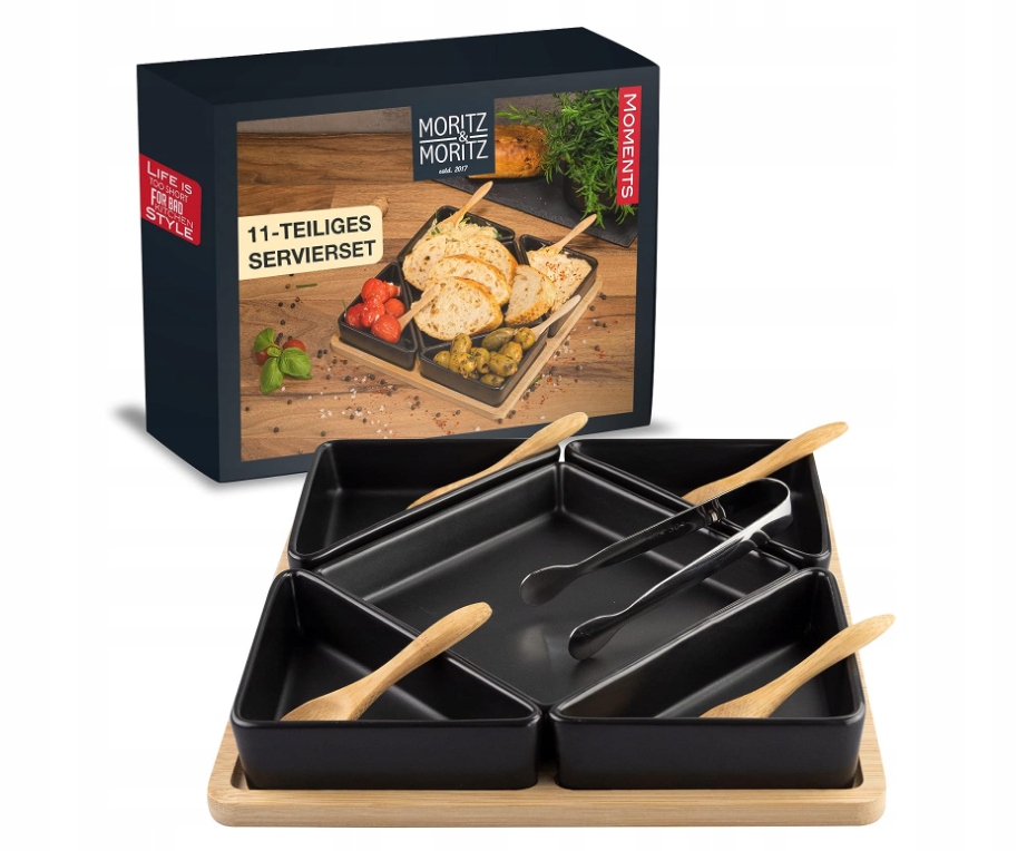 - ✅Элегантный сервиз - сервировочный набор из 11 предметов от Moritz & Moritz состоит из 5 керамических мисок для закусок с практичной бамбуковой сервировочной тарелкой, в комплект входят: 4 сервировочные ложки. и 1 сервировочные щипцы. Идеально подходит для любого приема пищи: завтрака, обеда или перекуса.