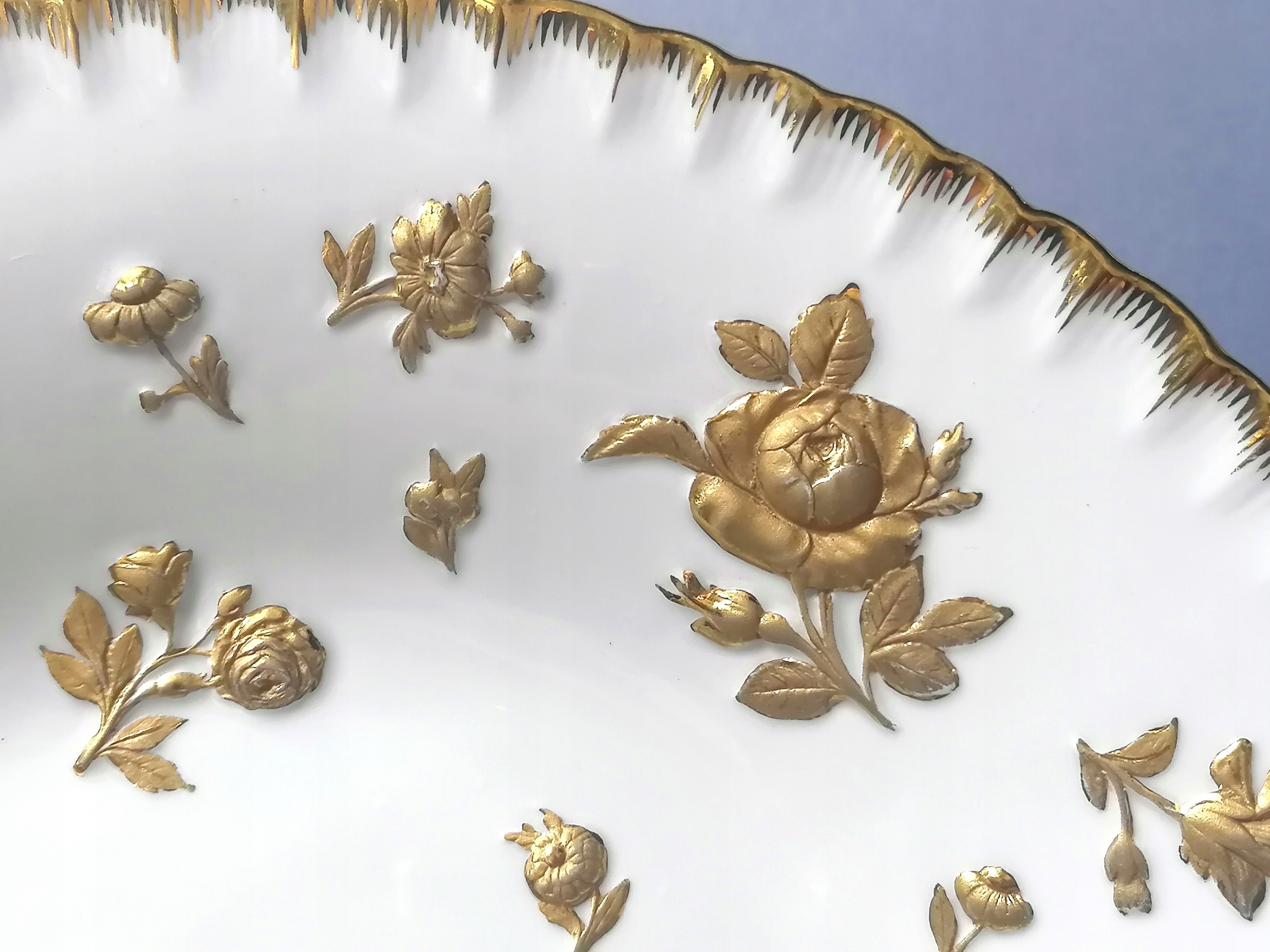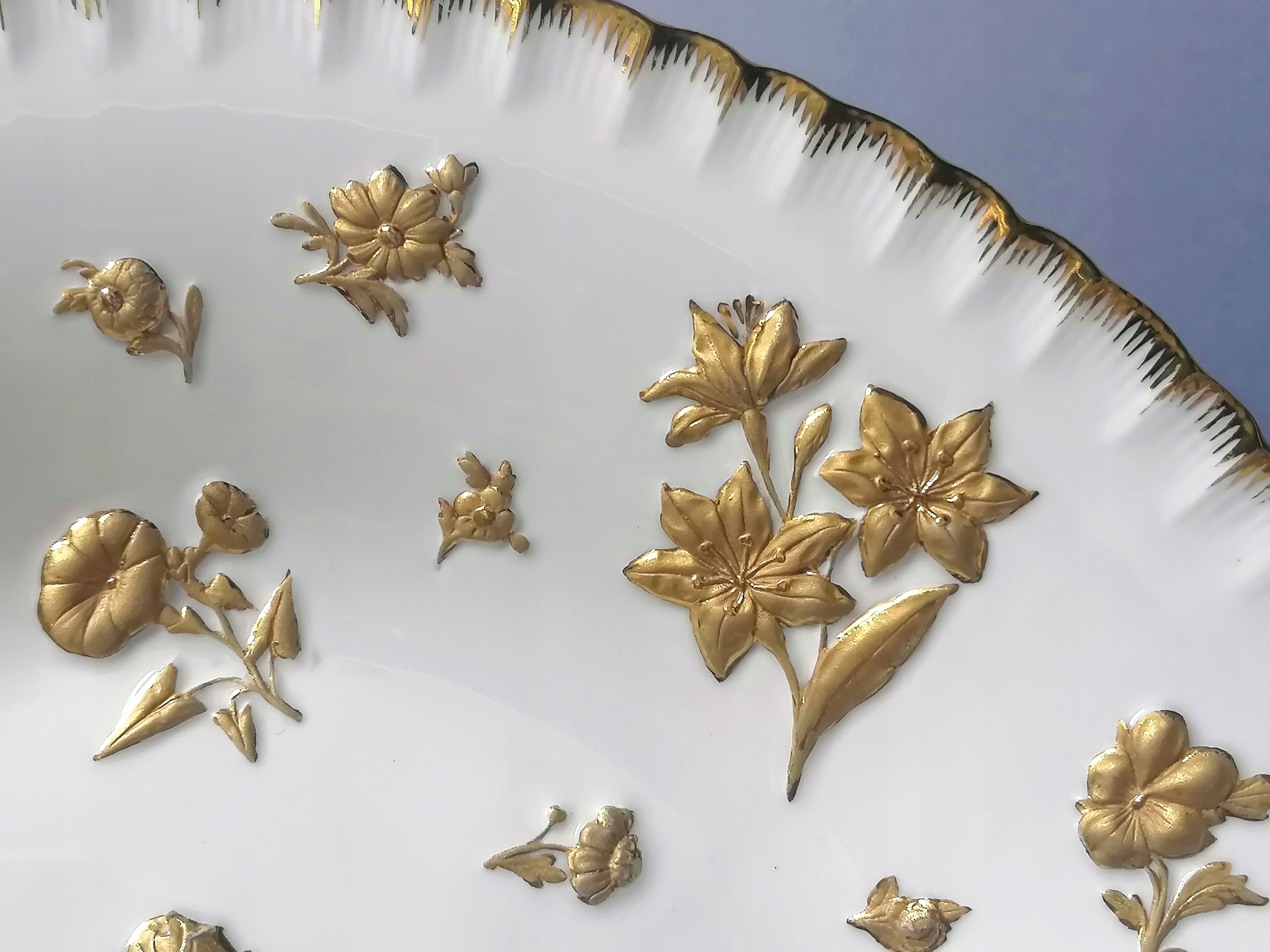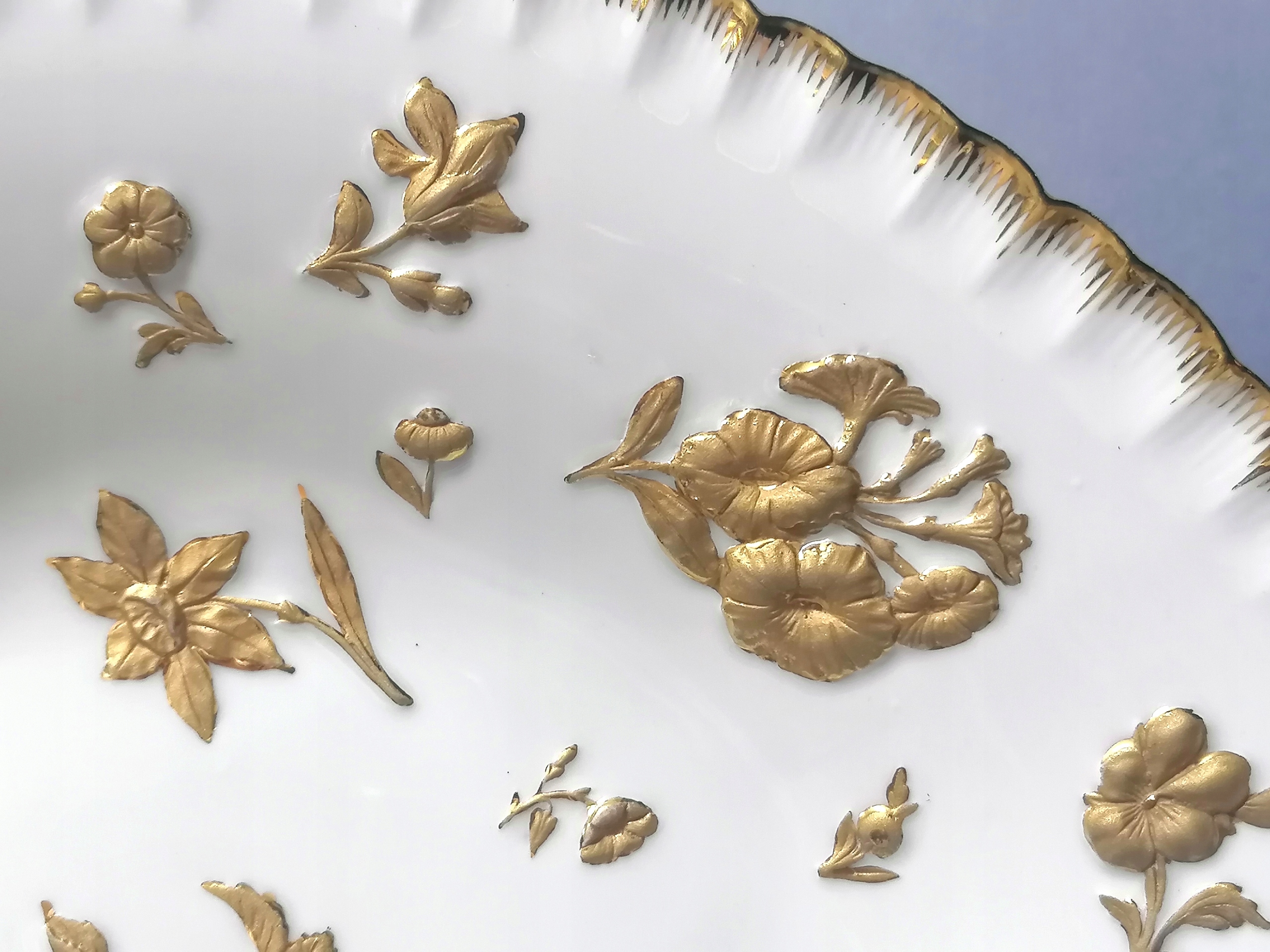 Белоснежный фарфор, причудливое тиснение - выпуклые цветочные букеты, ручная работа, надглазурная позолота.