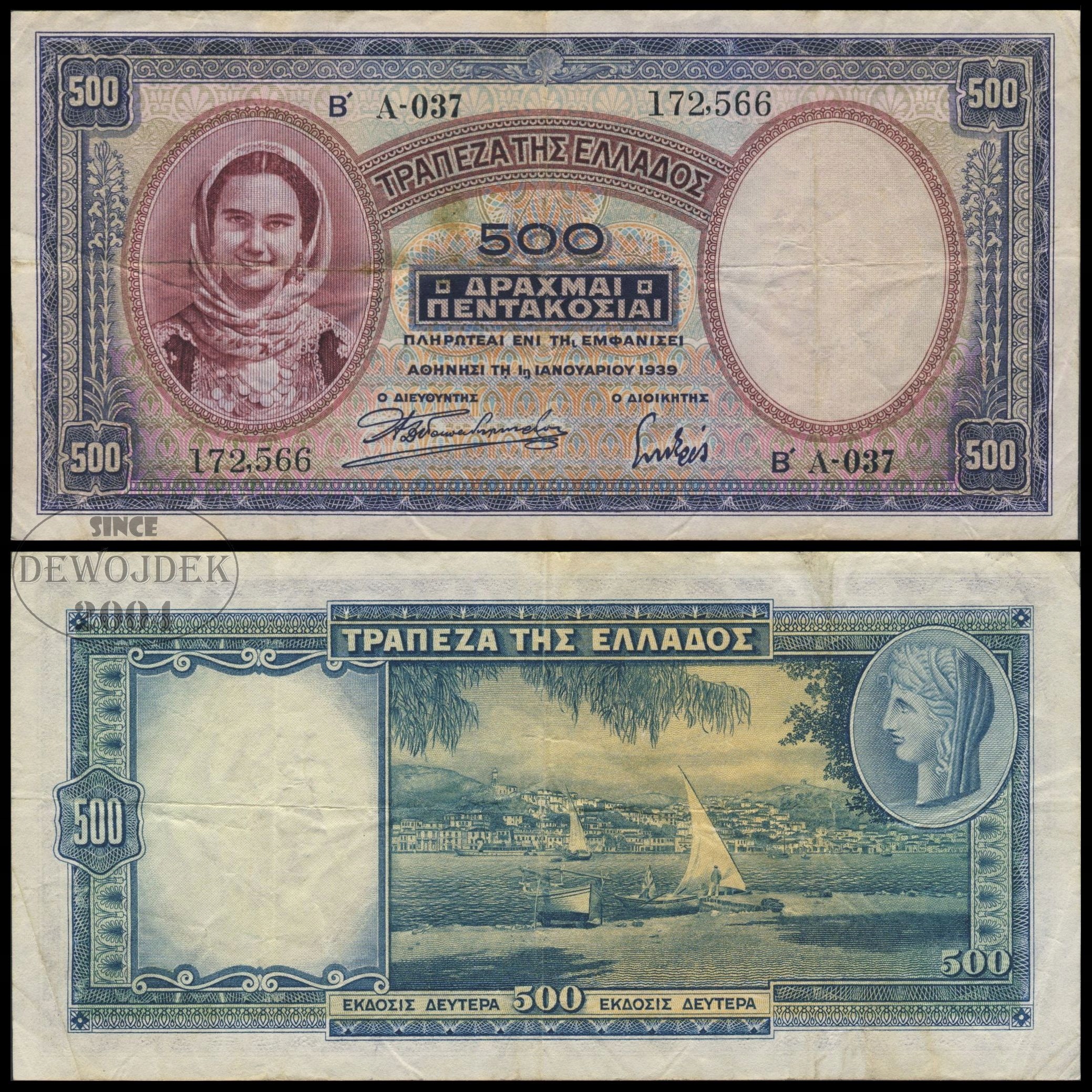 BNA - GRECJA 500 Drachm 1939 A-037 172,566 # P109b # ERROR ENI RZADSZY # VF