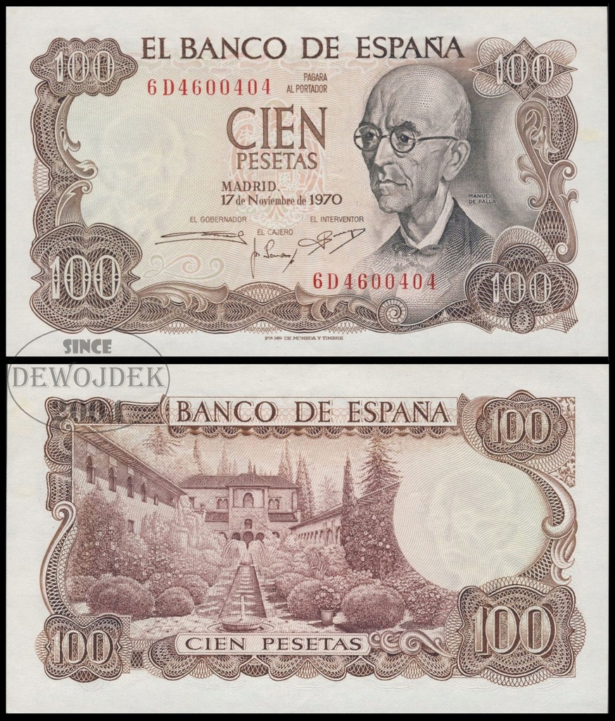 BNA - HISZPANIA 100 Peset Pesetas 1970 6D 4600404 # P152 # XF/UNC