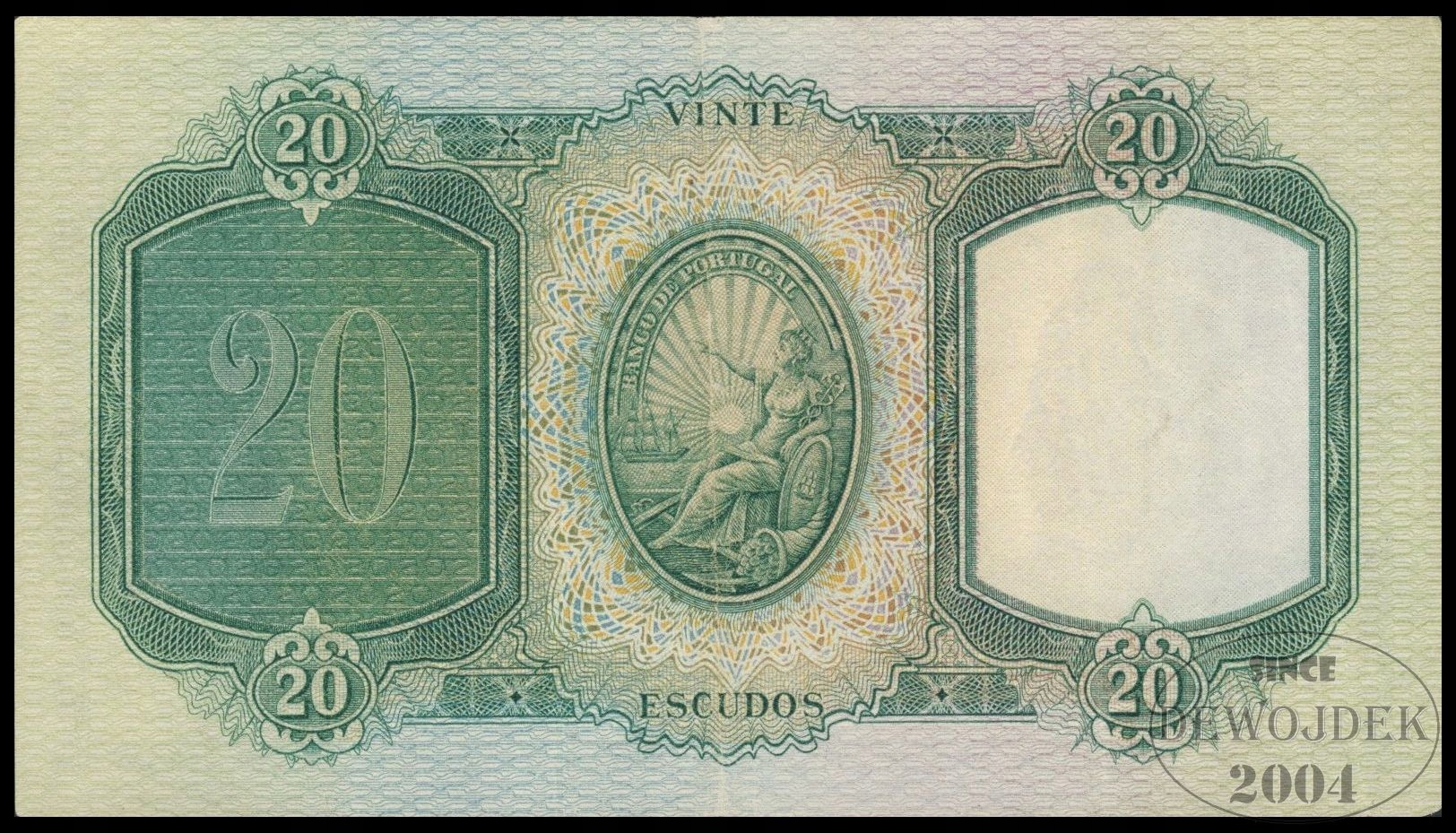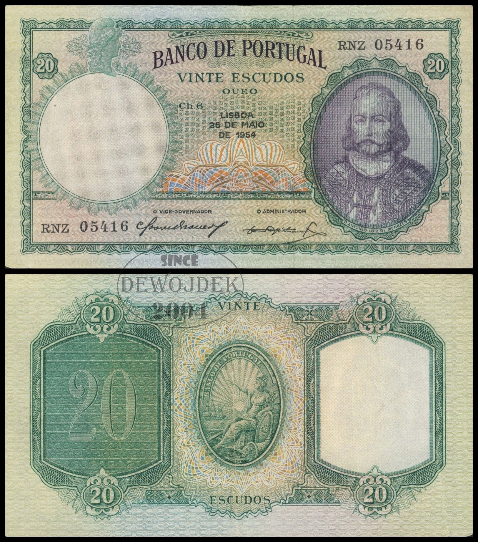 20 эскудо BNA - ПОРТУГАЛИЯ 1954 года RNZ 05416 # P153a # РЕДКАЯ # VF++