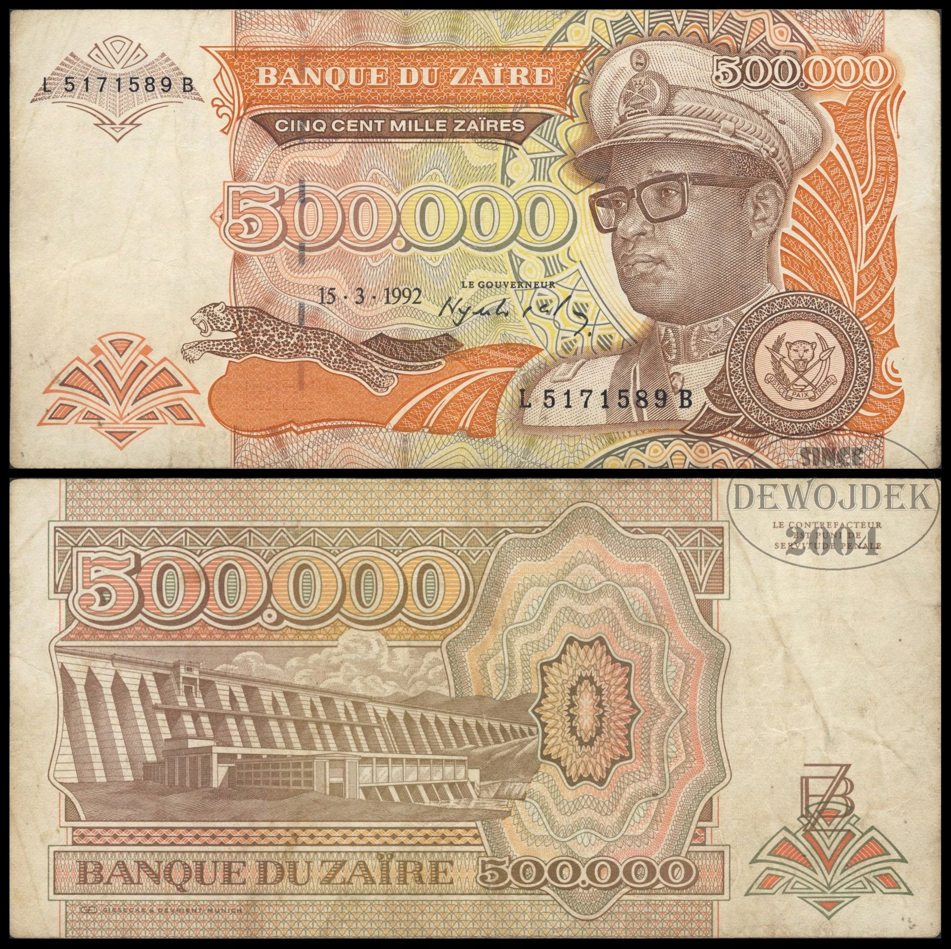 BNA - ZAIR 500000 Zaires 1992 L 5171589 B # P43 # F+