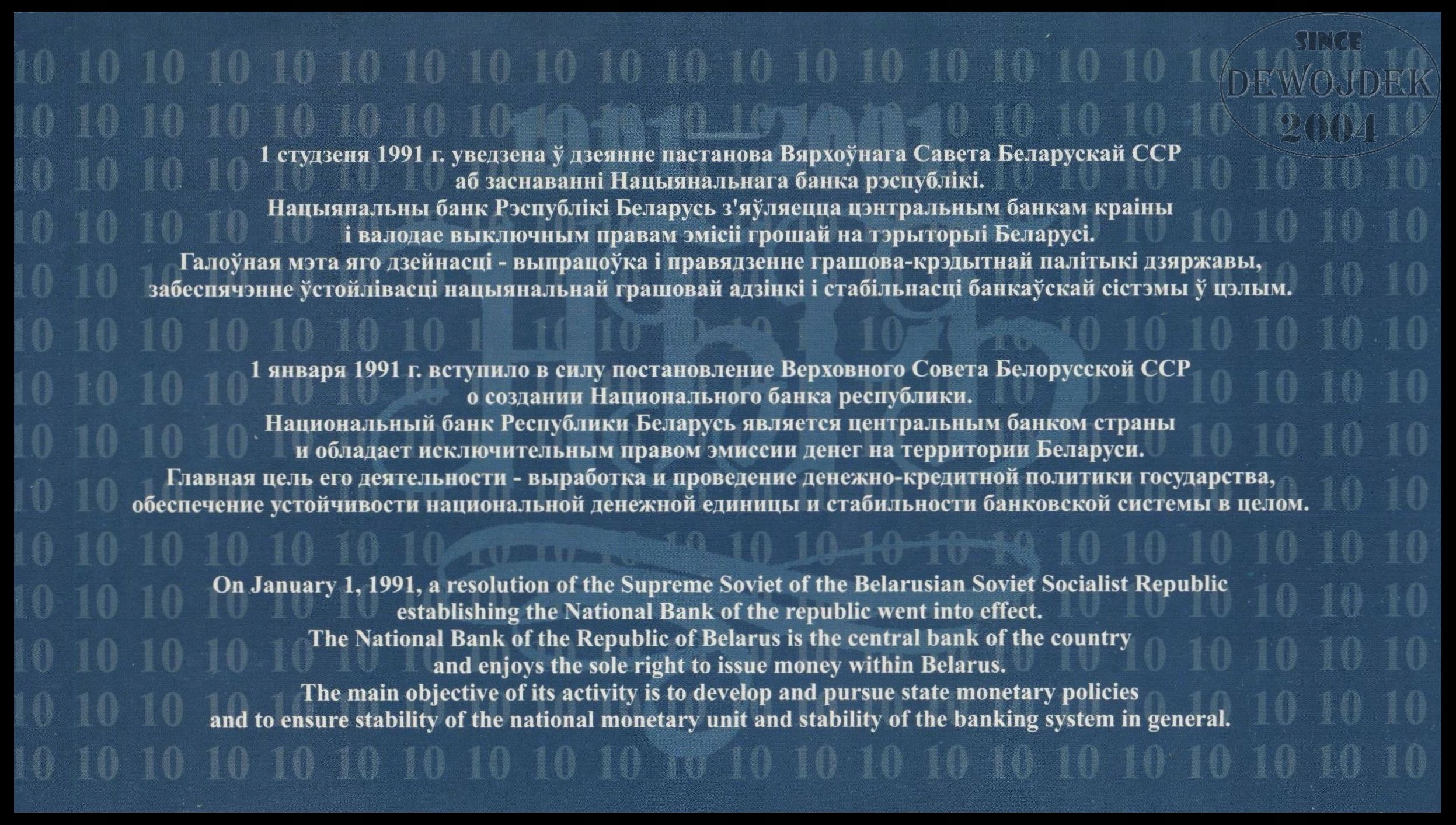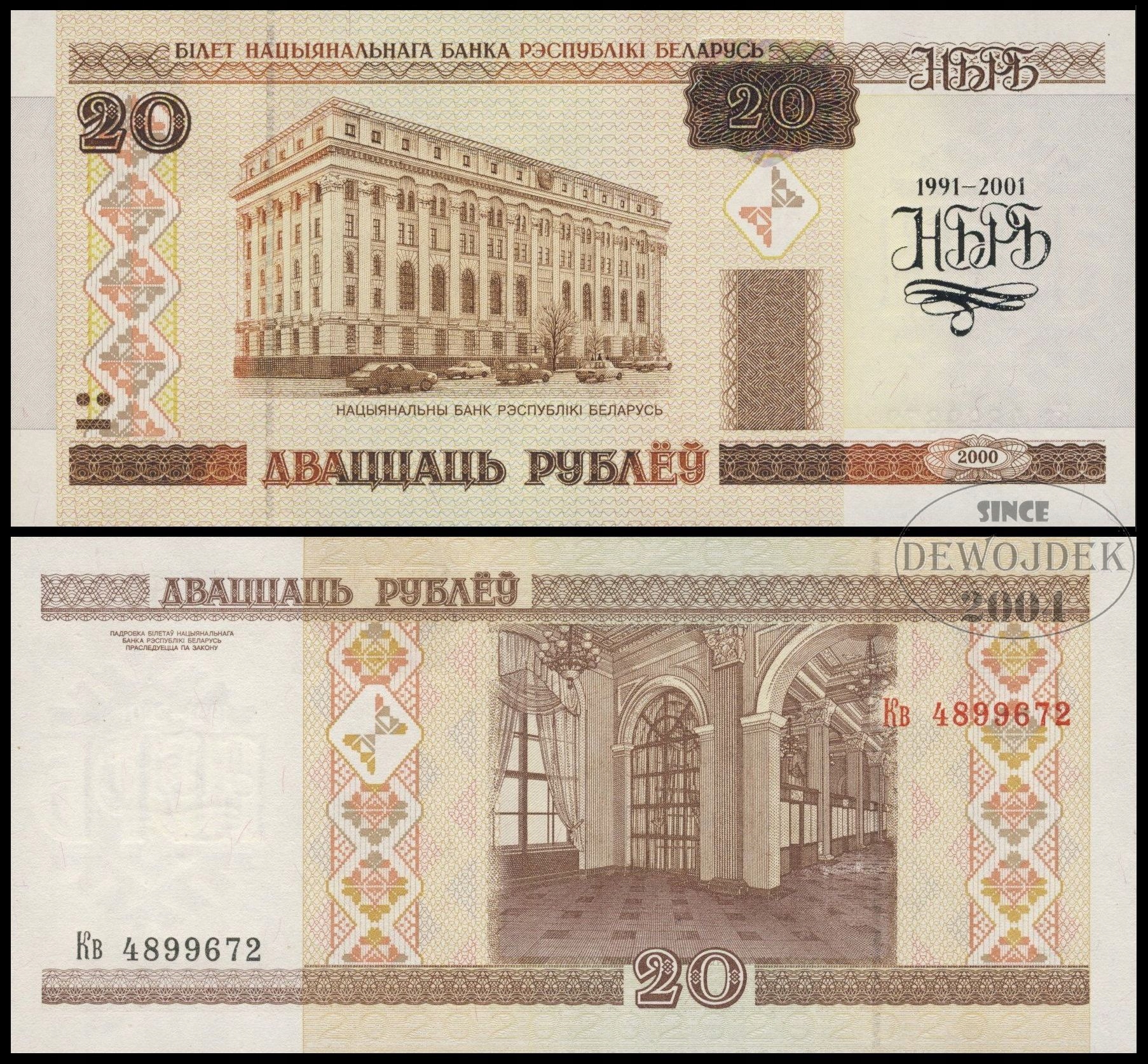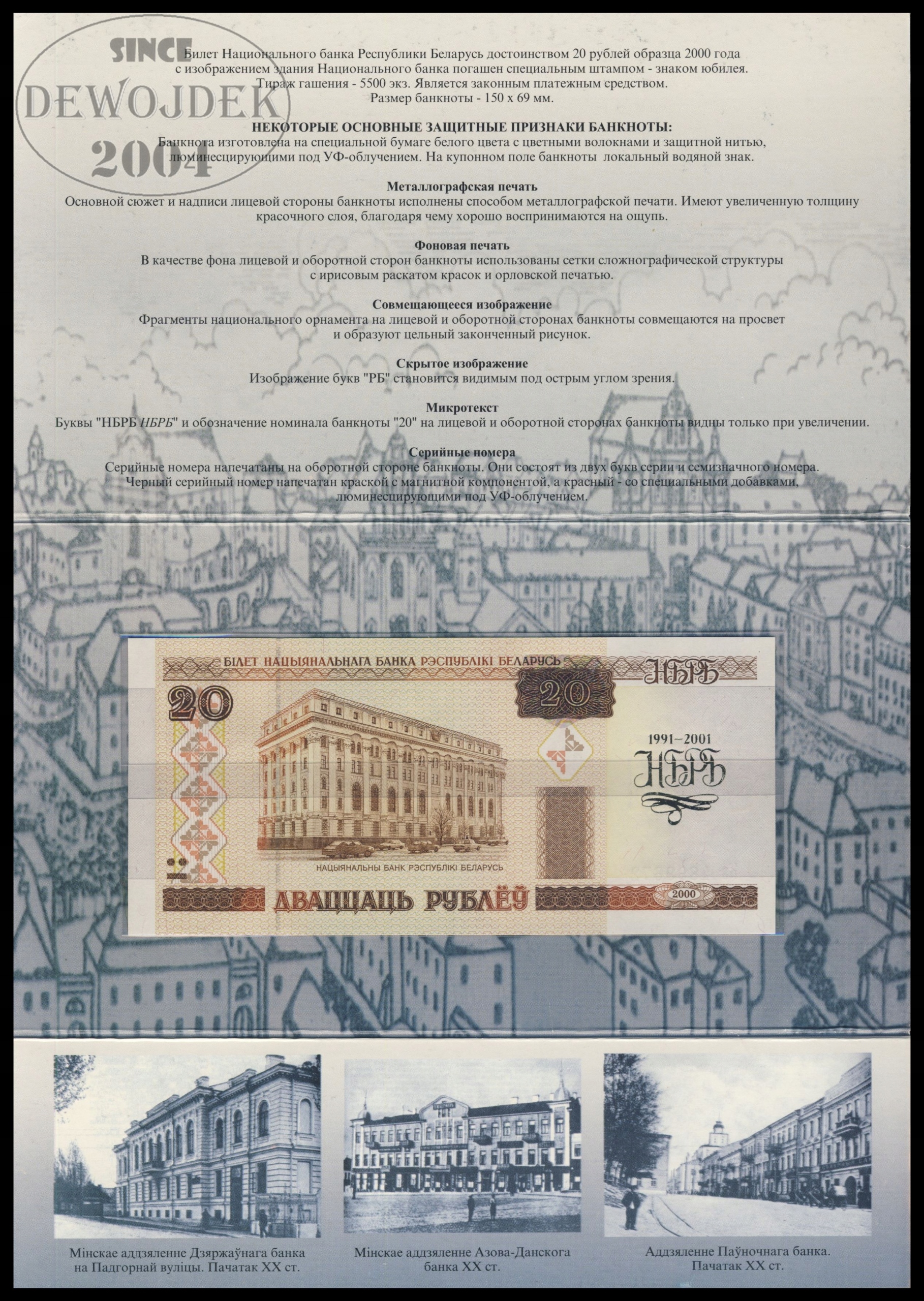 BNB - BIAŁORUŚ 20 Rubli 2000 / 2001 Кв # FOLDER # P33 # 10 LAT BANKU # UNC