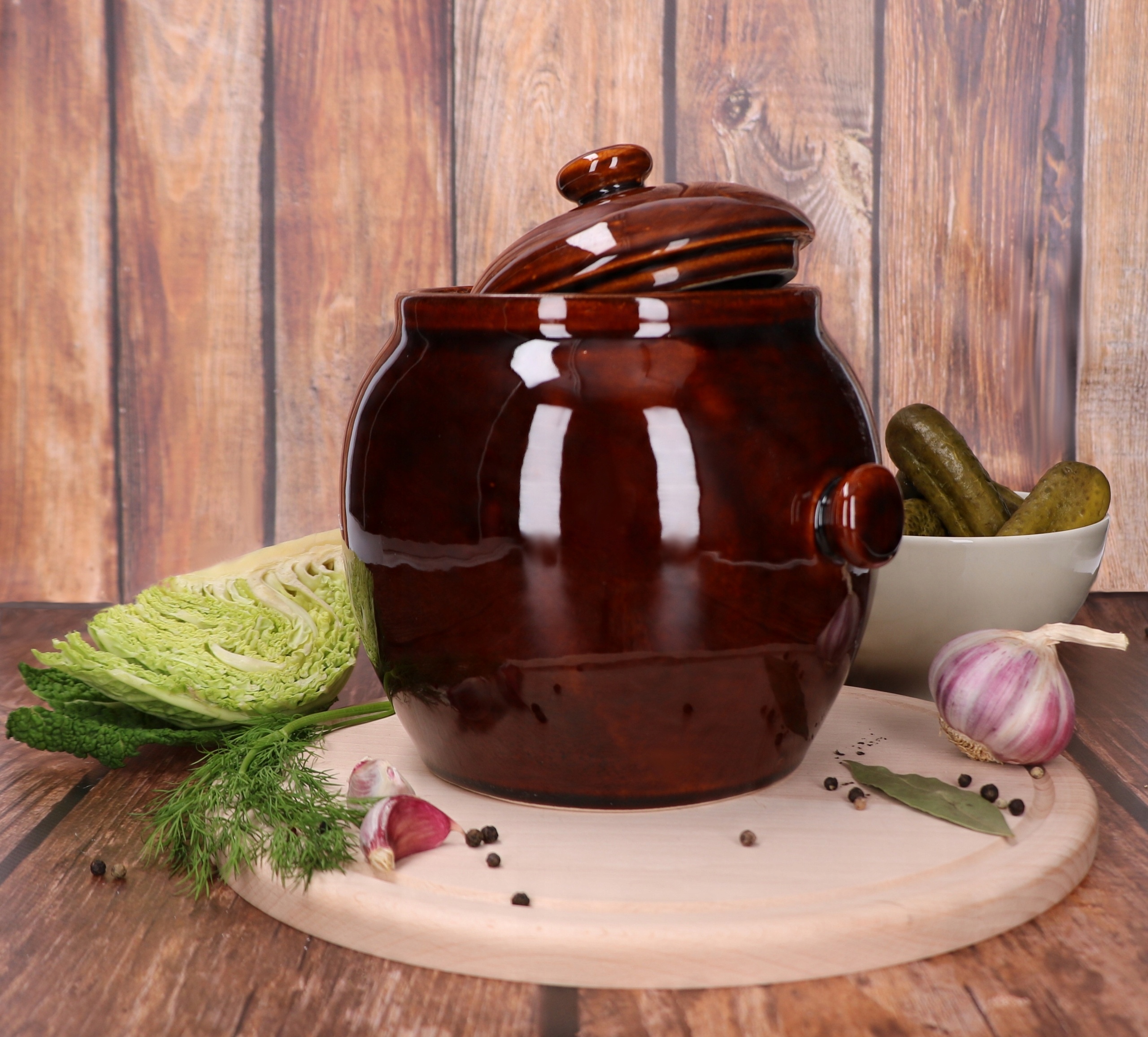 - Округлая форма и большое отверстие вверху позволяют идеально расположить овощи для маринования.