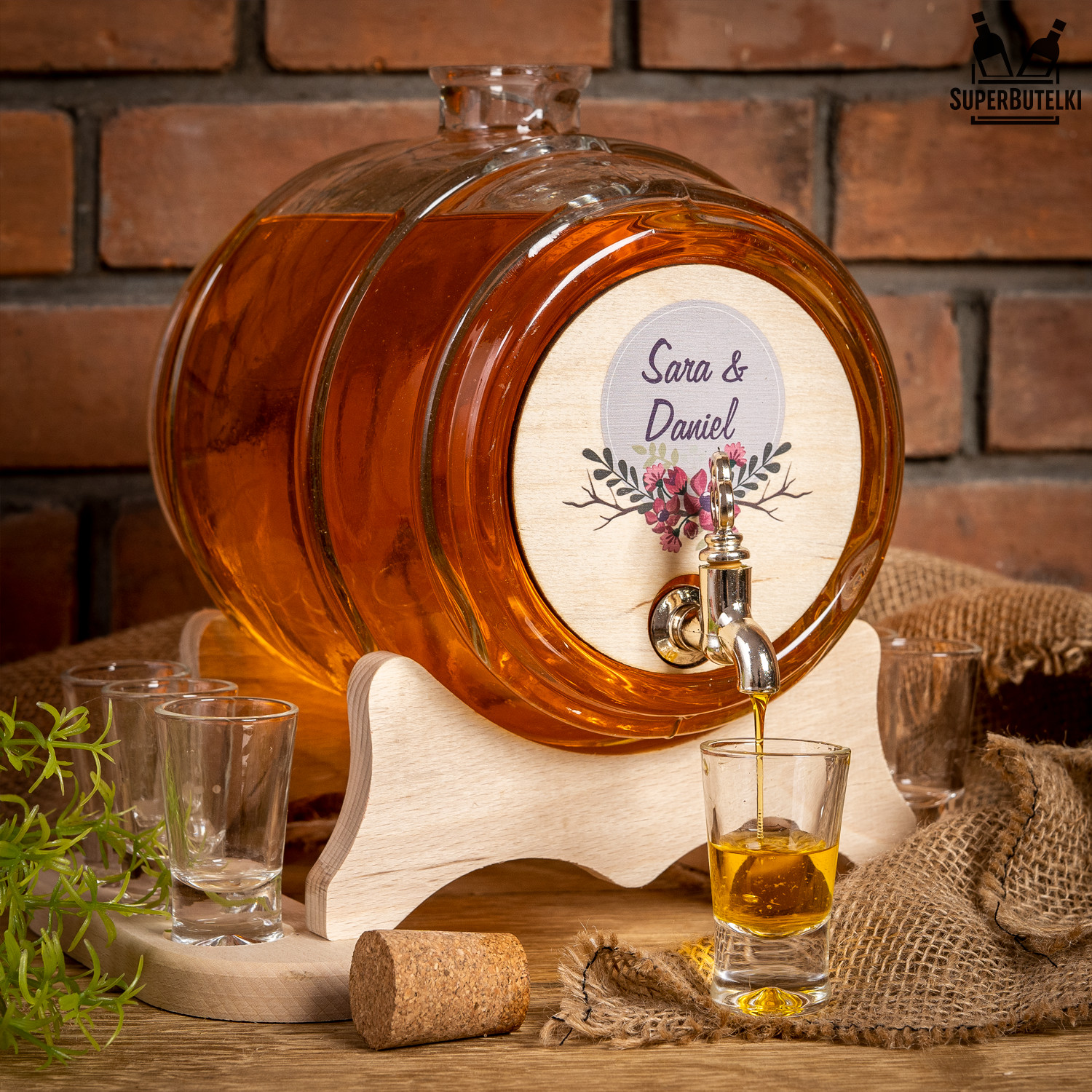 емкостью 4 л с краном, подставкой, ДЕРЕВЯННОЙ ТАРЕЛКОЙ в стиле РУСТИК и 6 стаканами на свадьбу или крещение, С ИНДИВИДУАЛЬНЫМ ПРИНТОМ.