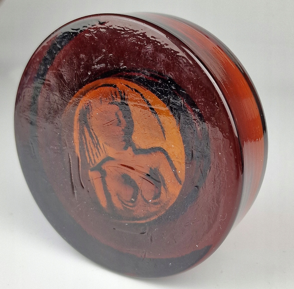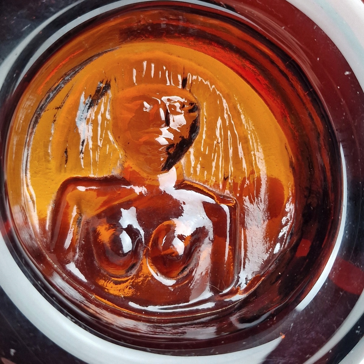 Потрясающая скандинавская стеклянная миска/блюдо янтарного/коричневого цвета с толстыми стенками и рельефным изображением обнаженной женщины в центре. p>