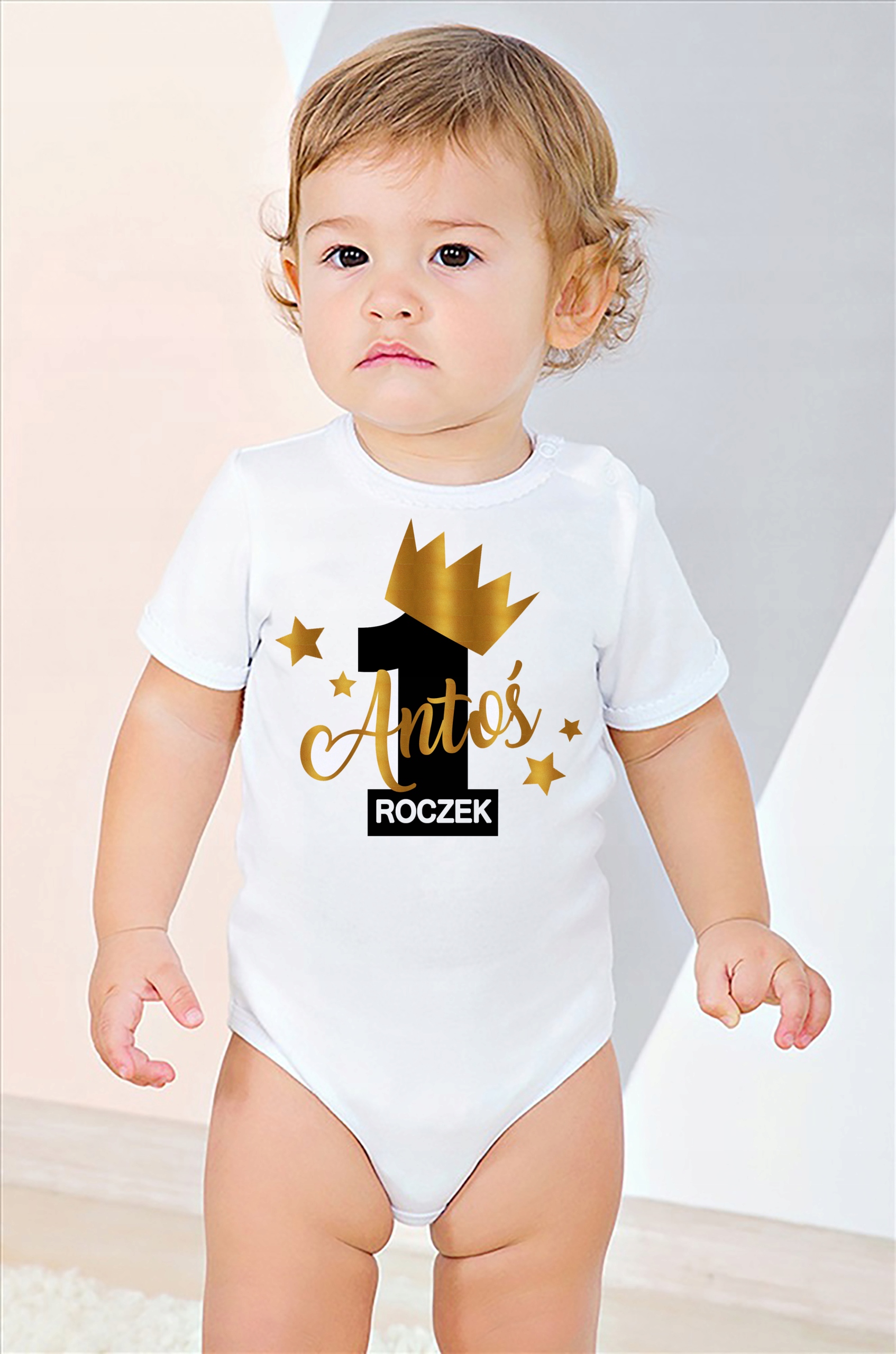 Детское боди с принтом на первый день рождения с любым именем ребенка. Красиво Изделие выполнено из 100 г. % хлопка на ощупь, что делает его устойчивым к повреждениям и приятным для чувствительной кожи ребенка. Практичная застежка-кнопка облегчает одевание ребенка. Печать флексовой и флоковой фольгой — самая долговечная и проверенная технология печати.