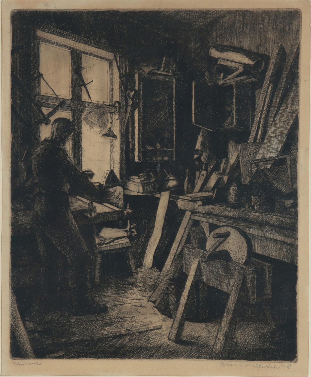 Графика с изображением плотника в ее мастерской.