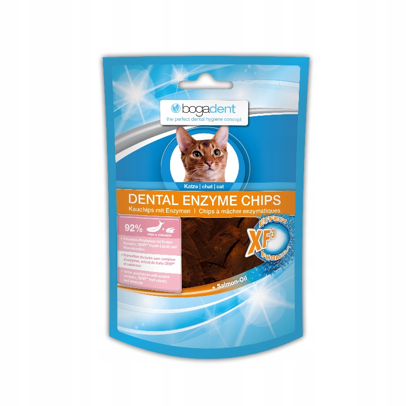 bogadent® РЫБНЫЕ ЧИПСЫ С ДЕНТАЛЬНЫМИ ФЕРМЕНТАМИ — это восхитительные стоматологические деликатесы, на 92% состоящие из рыбы и курицы. Функционально дополненные инновационной формулой XF3 - Effect Formula, состоящей из натуральных ферментов концентрированной сыворотки и двух дополнительных активных ингредиентов (экстракт фруктов CB90MX и минералы), чипсы сочетают в себе ежедневный уход за зубами и вознаграждение. Особая консистенция вкусных дентальных ферментных чипсов также очищает зубы во время жевания.