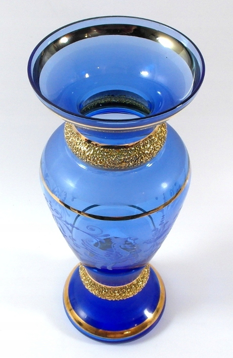 Красивая, старинная ваза ручной работы из тонированного хрустального стекла, украшенная обильным позолотой и сложной огранкой. Ваза имеет рейтинговую карту.