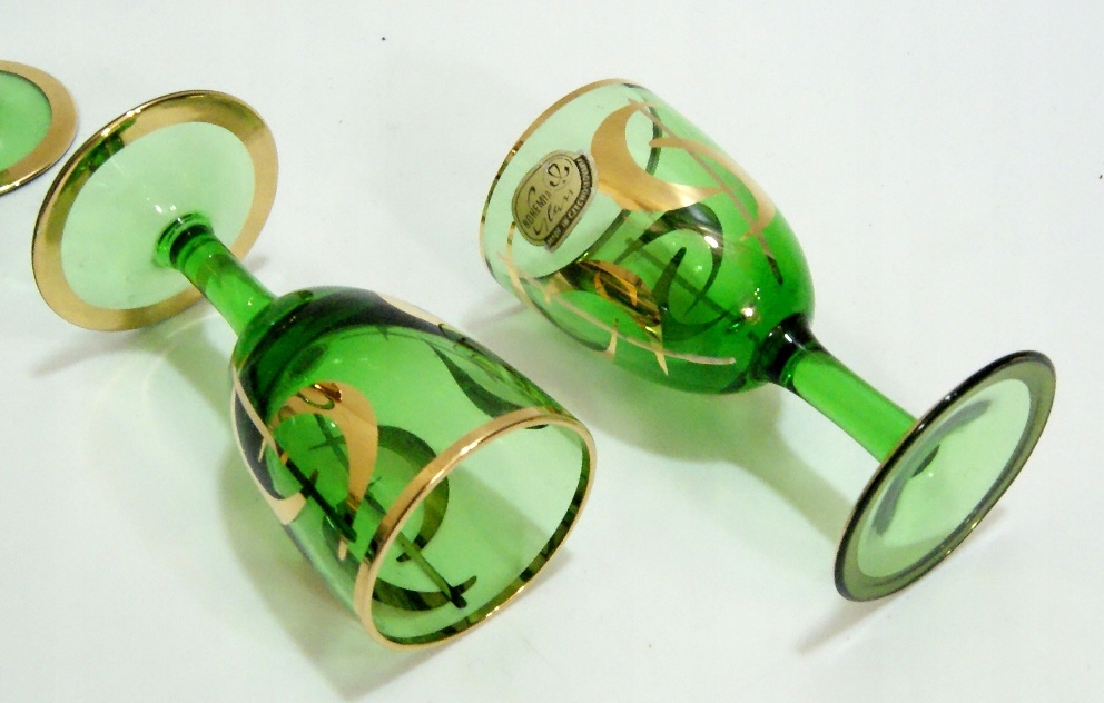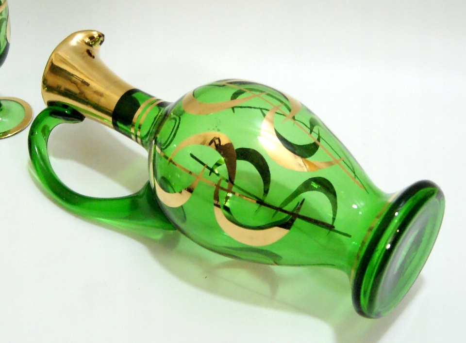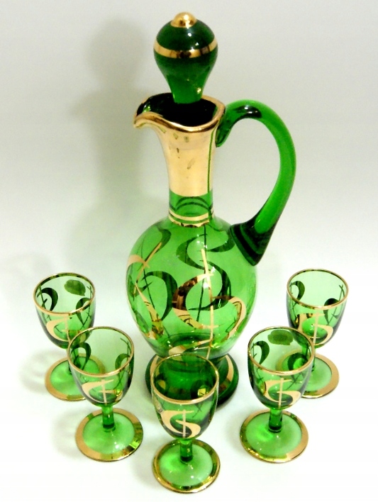 Красивый старинный графин + 5 стаканов, из зеленого хрустального стекла.Цельная пробка, позолоченный узор.