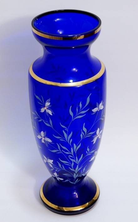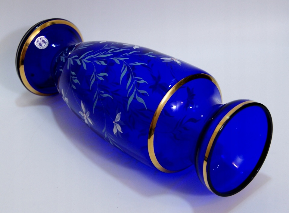 Красивая, старинная ваза из кобальтового хрусталя, украшенная ручной росписью, четко выпуклым цветочным узором..