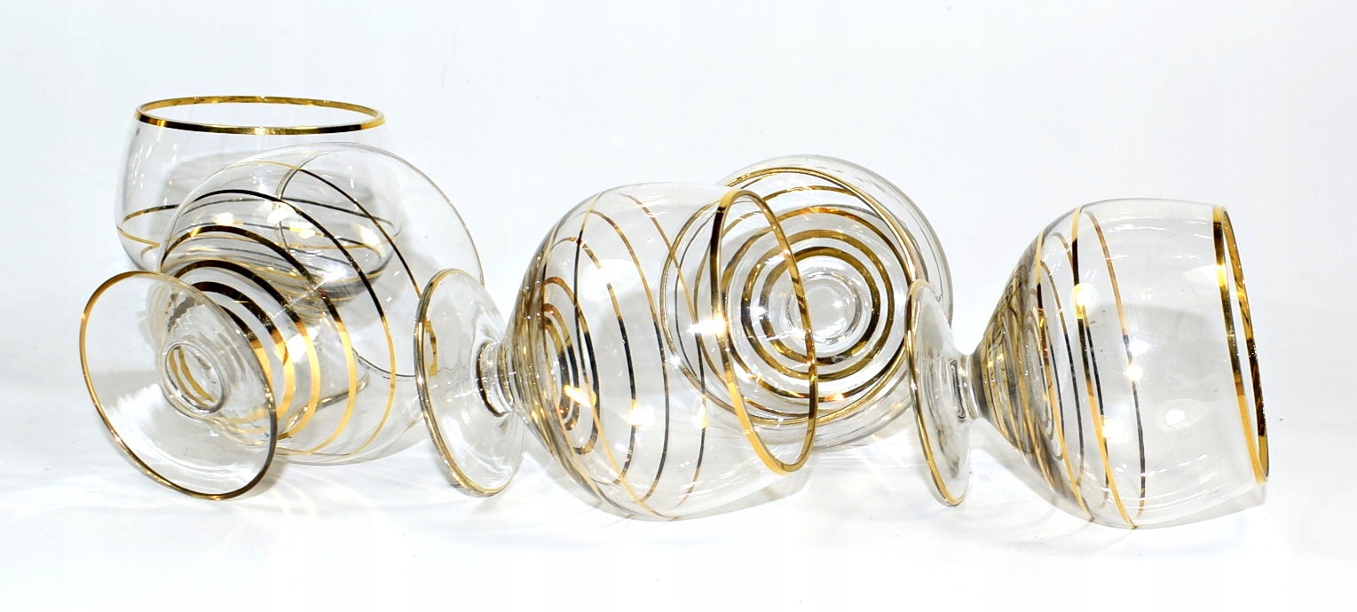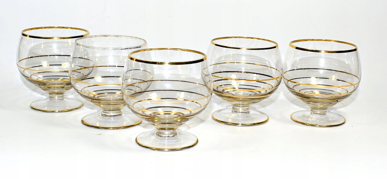 Старинный набор из 5 старых или винтажных бокалов из бесцветного хрусталя - красиво украшенных золотом.