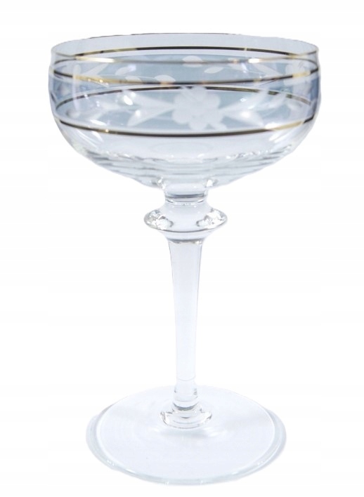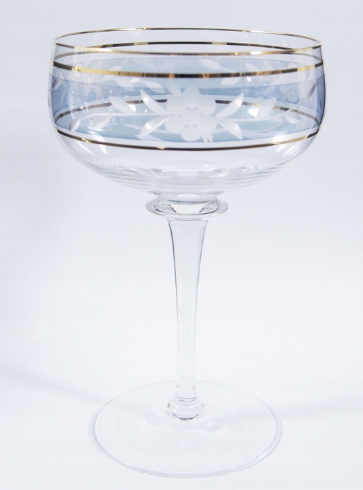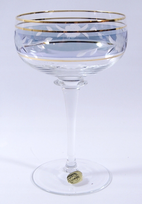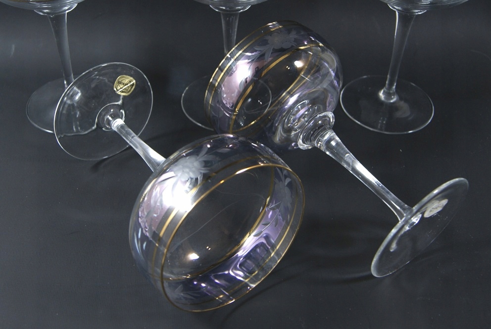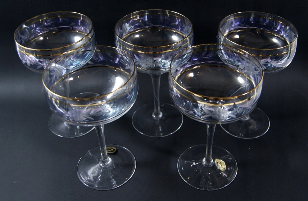 Красивый набор из 5 бокалов из бесцветного хрустального стекла, вырезанный узор на слегка переливающемся фоне.