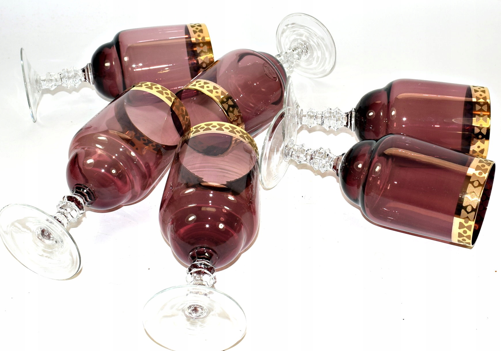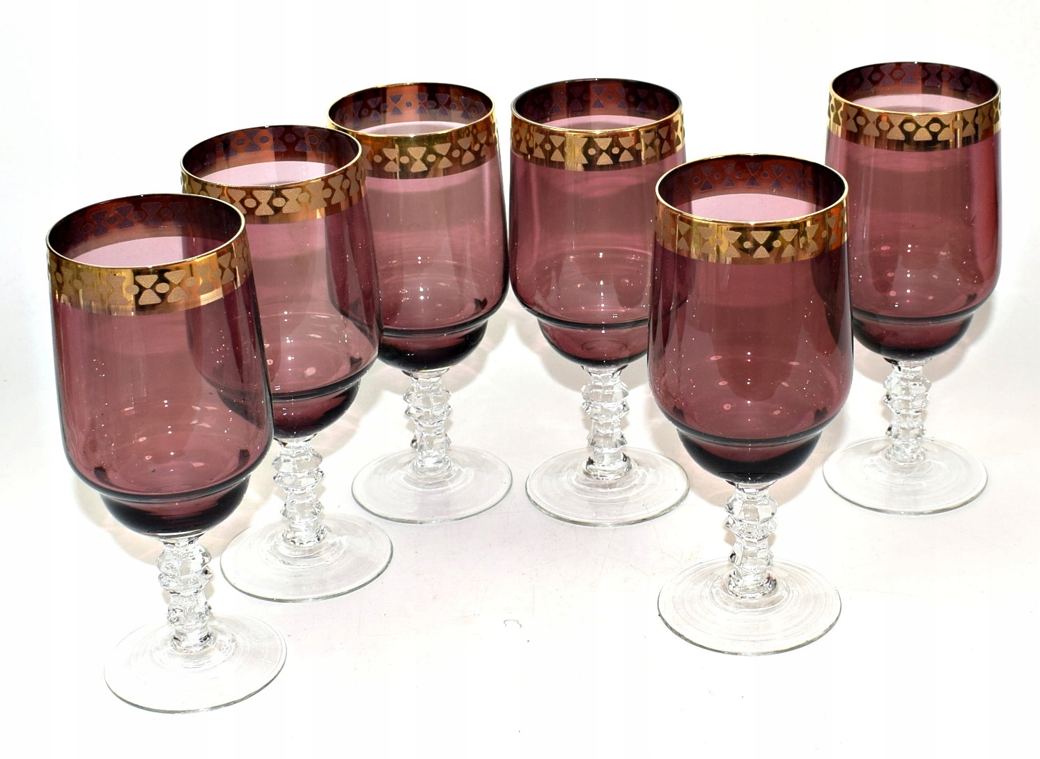 Красивый старинный набор из 6 стаканов из фиолетового хрусталя, украшенный толстым позолотой. Старые очки, покрашенные в массе. Богемия.